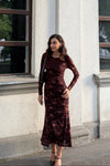 Designs: The appeal of this dress lies in its lovely floral velvet pattern. It features a bodycon fit and maxi length, effortlessly defining your curves and highlighting your figure. What sets it apart is the loose, flowy hem that exudes elegance and grace with every step