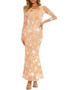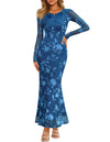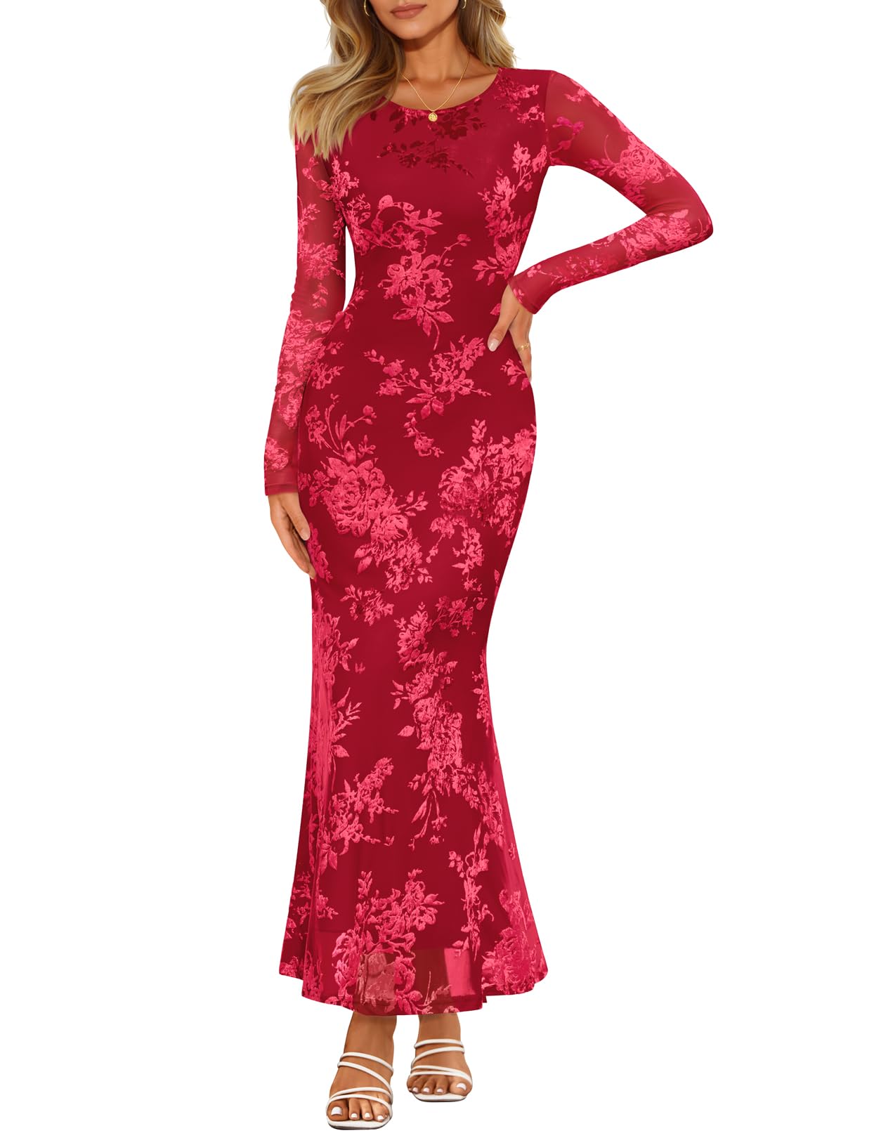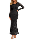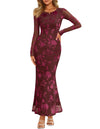 Features: This women's cocktail dress features a floral velvet pattern, long sleeves, maxi length, elastic mesh fabric, round neck, with stretch lining no see-through, slim fit, ruffled hem, ruched side, wedding guest dress, maxi dresses, bodycon dresses for women, fall dresses for women 2025, tea party dresses for women