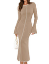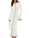 Features: Long flare sleeve, crew neck, contrast trim design, calf length, solid color, slim fit sweater dress. This elegant sweater dress hugs your curves gracefully with flattering bell sleeves and a color block design, creating a feminine delicacy. Women's fall fashion 2025