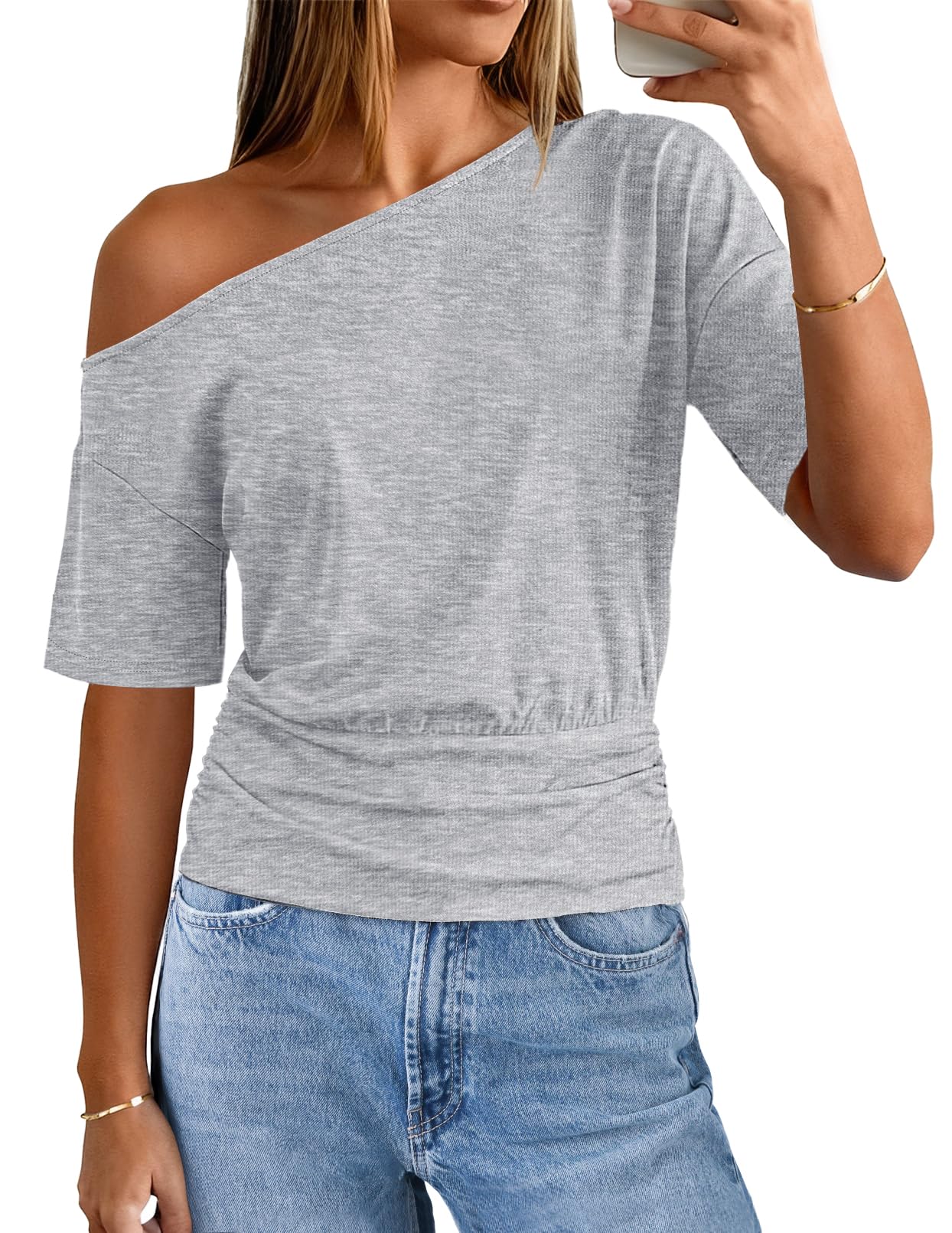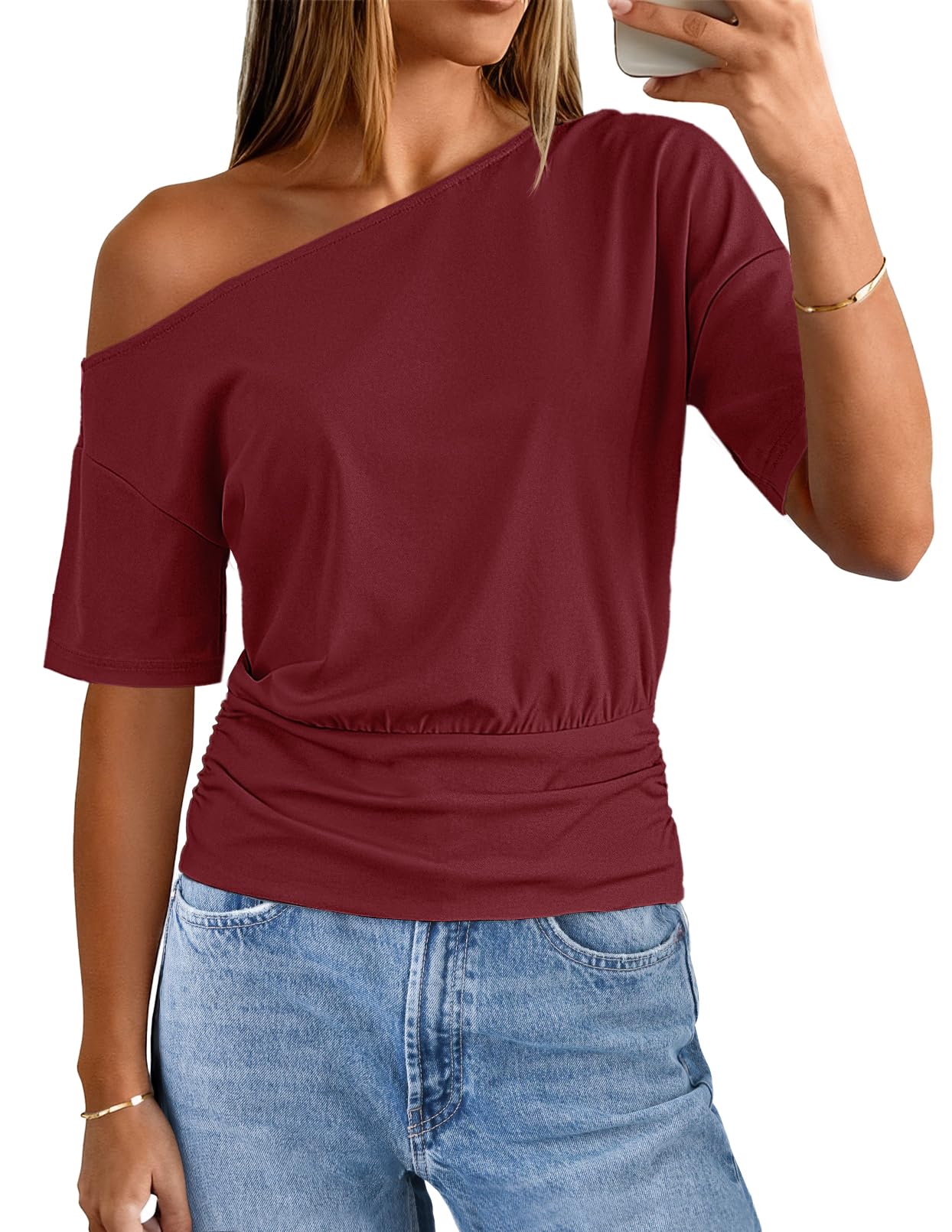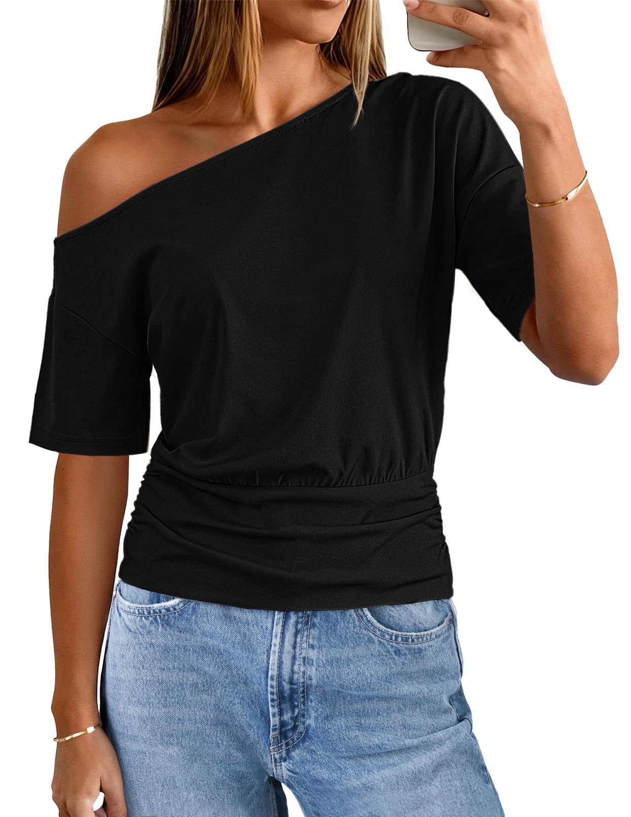 Features: Off the shoulder, asymmetrical neck, short sleeve, elastic cinched waist, loose fit, tops for women trendy, summer tops for women, spring tops for women, cute tops for women, going out tops for women, sexy tops for women, t shirts for women, blouses for women dressy casual
