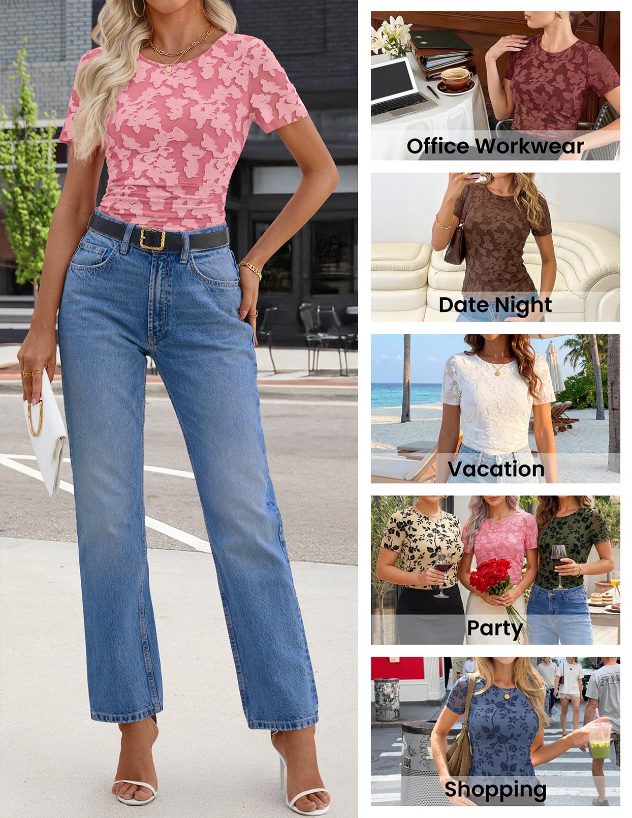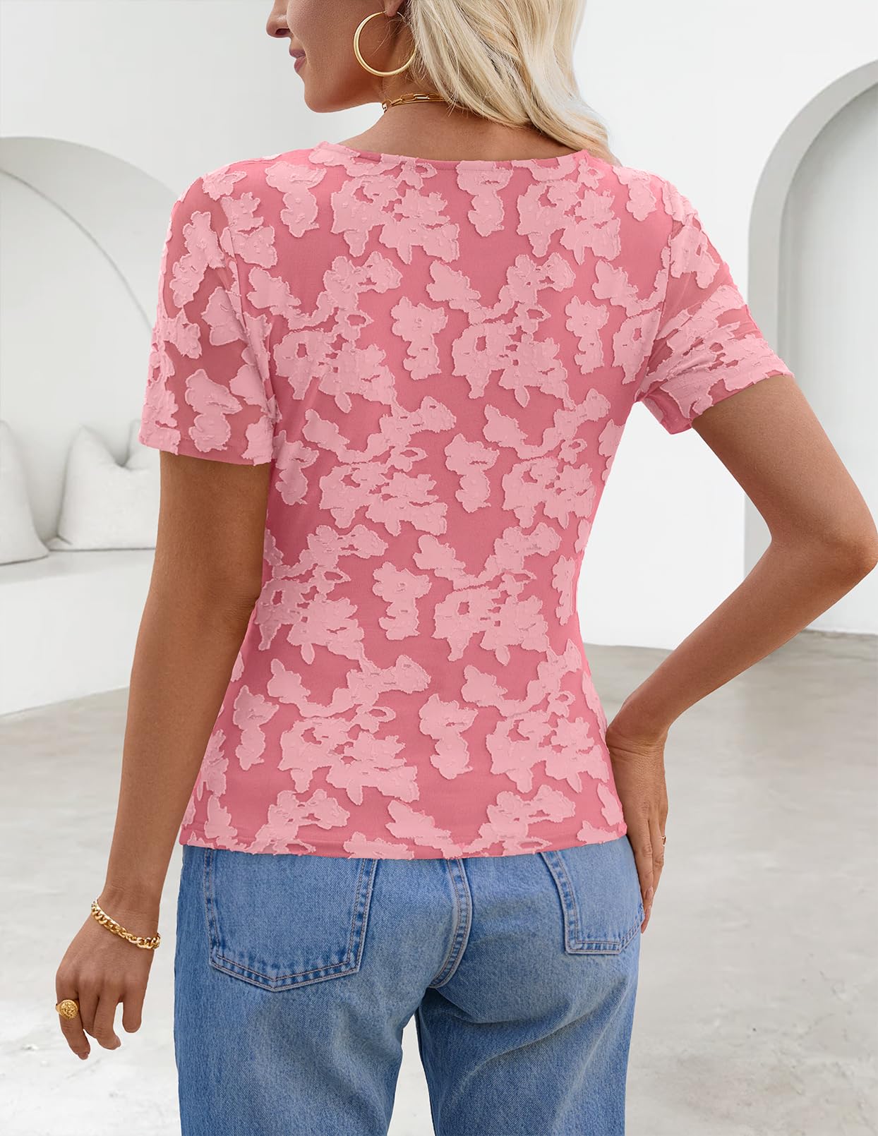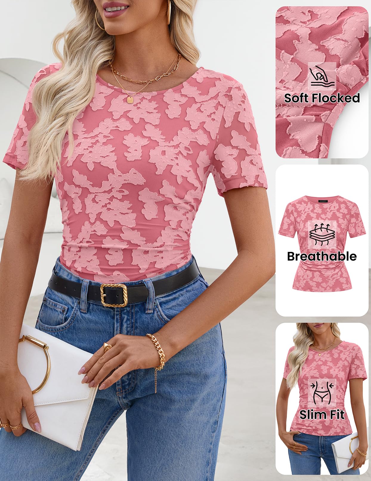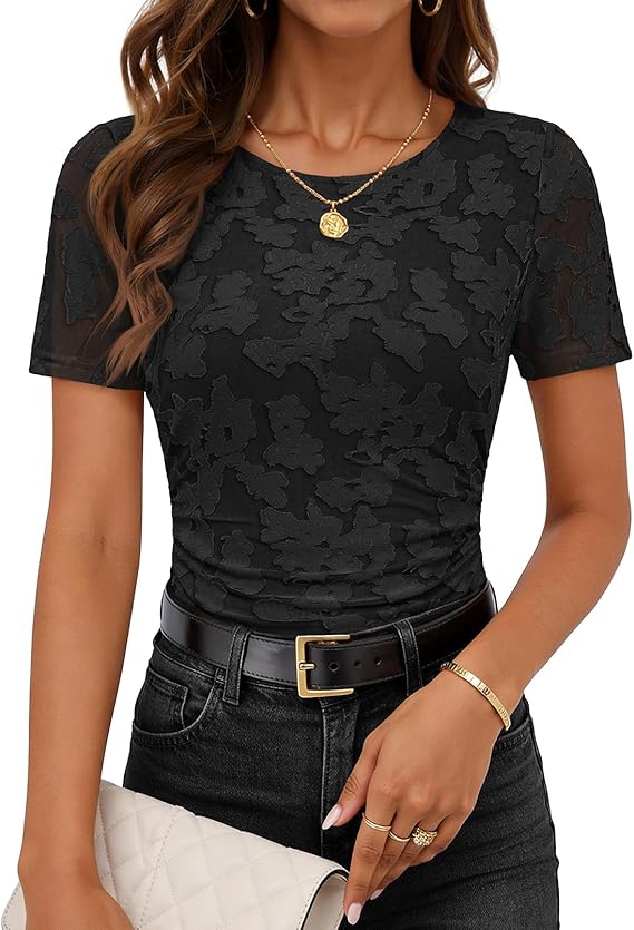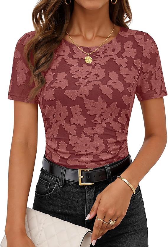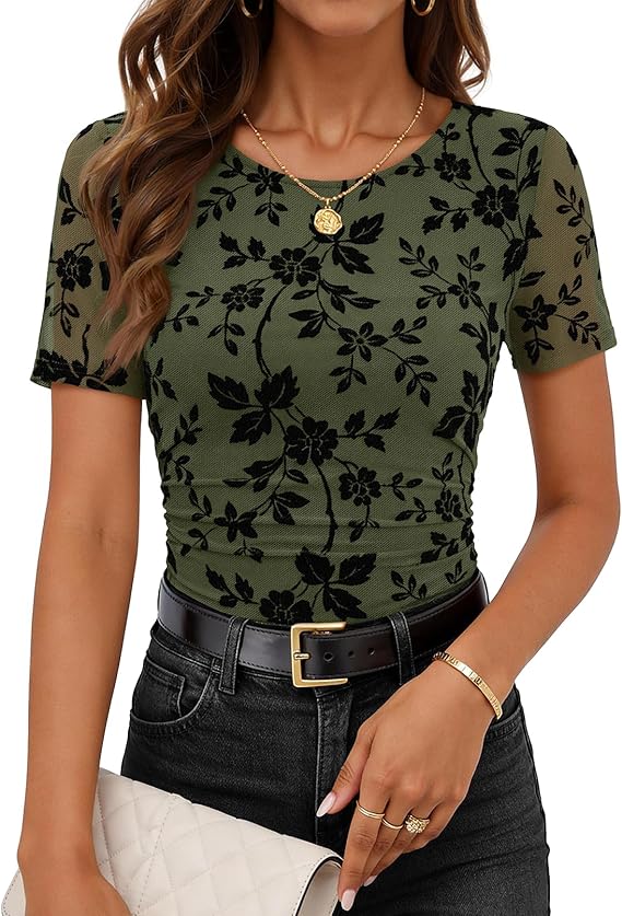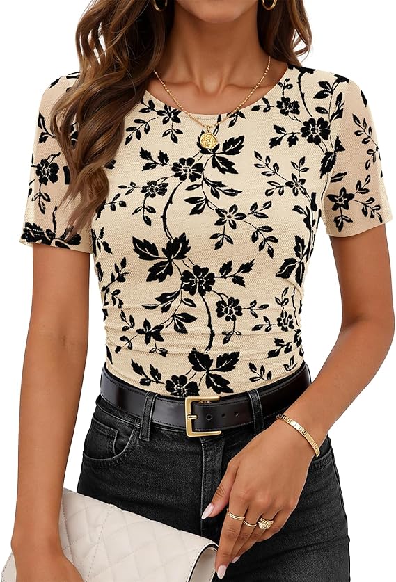 MEROKEETY Women's 2026 Summer Short Sleeve Floral Tops Spring Vacation Dressy Casual Crewneck Slim Fit Mesh T Shirt Blouses
