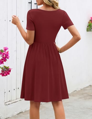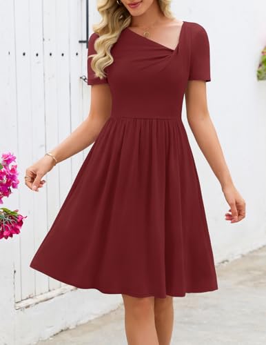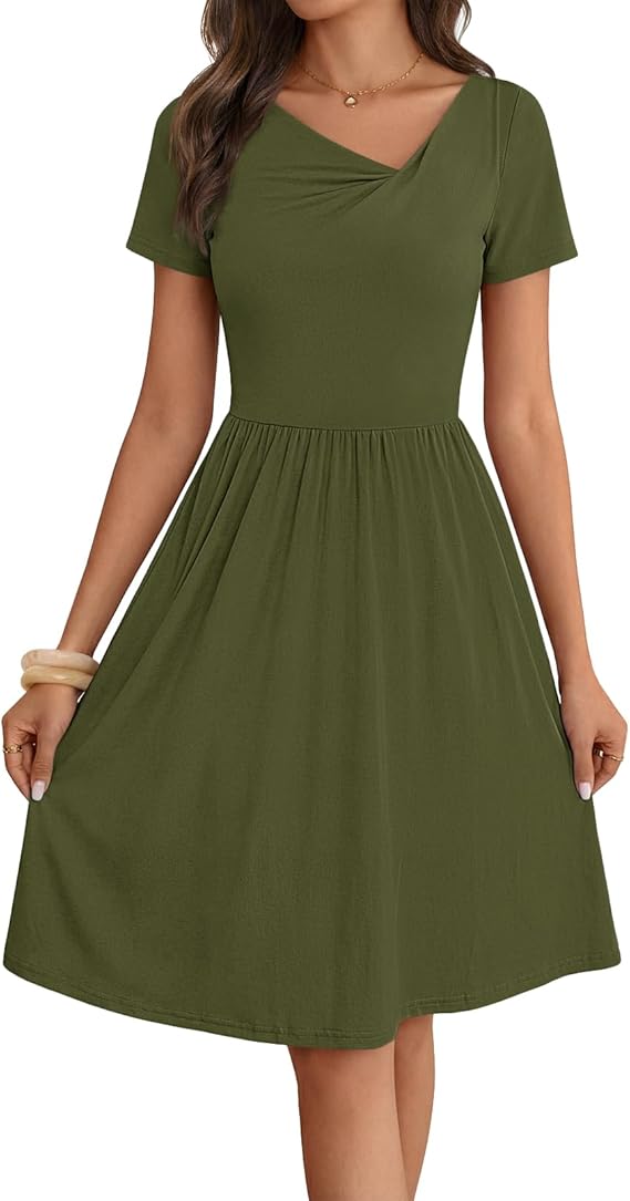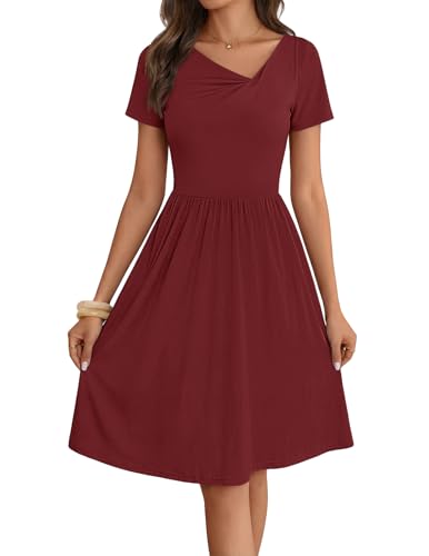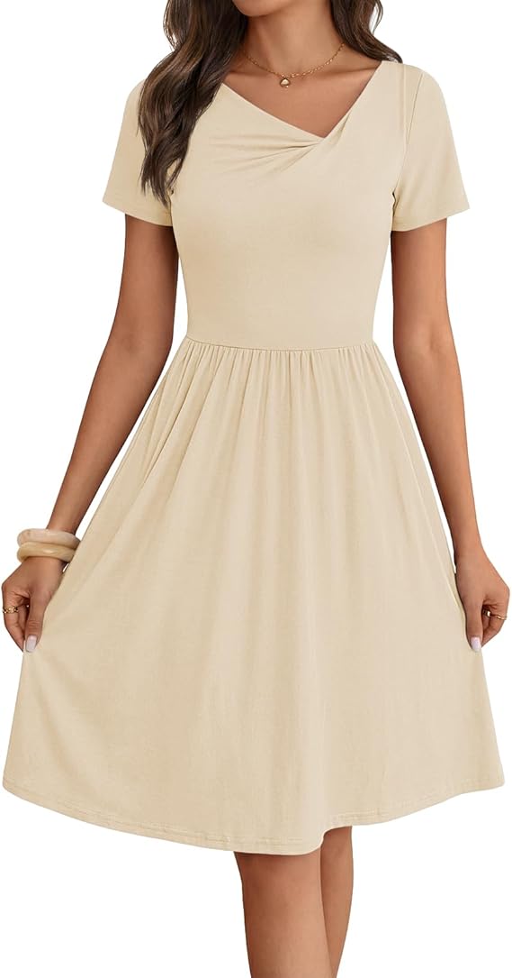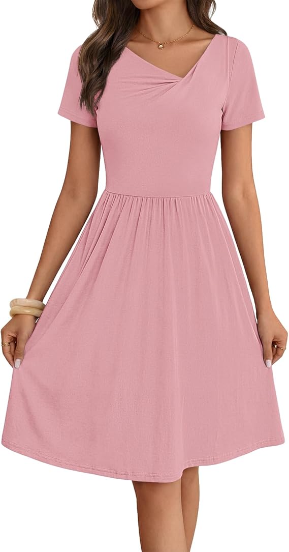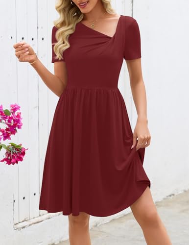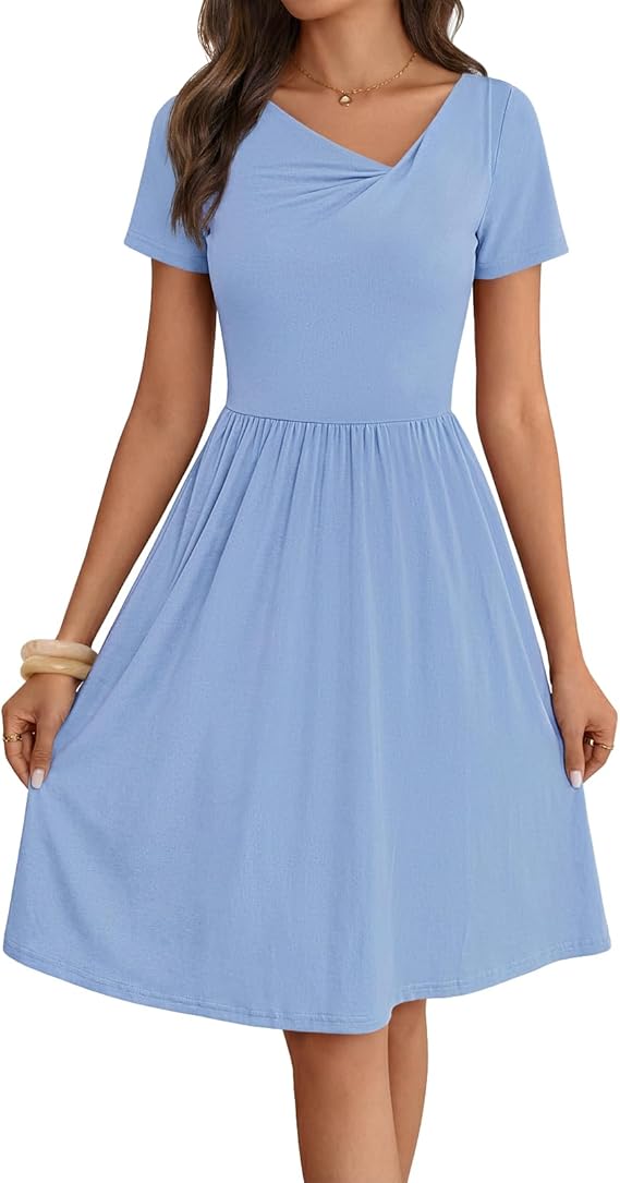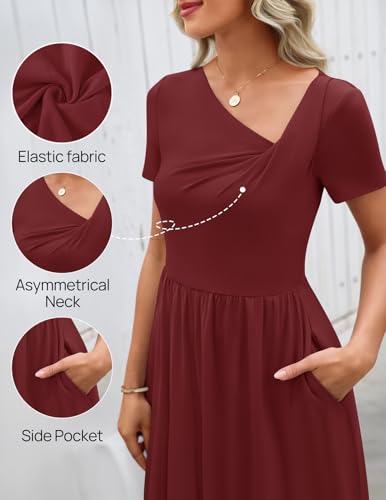 MEROKEETY Women's Asymmetrical V Neck Mini Dress 2026 Spring Summer Short Sleeve Ruched Casual A Line Tshirt Dresses Pockets