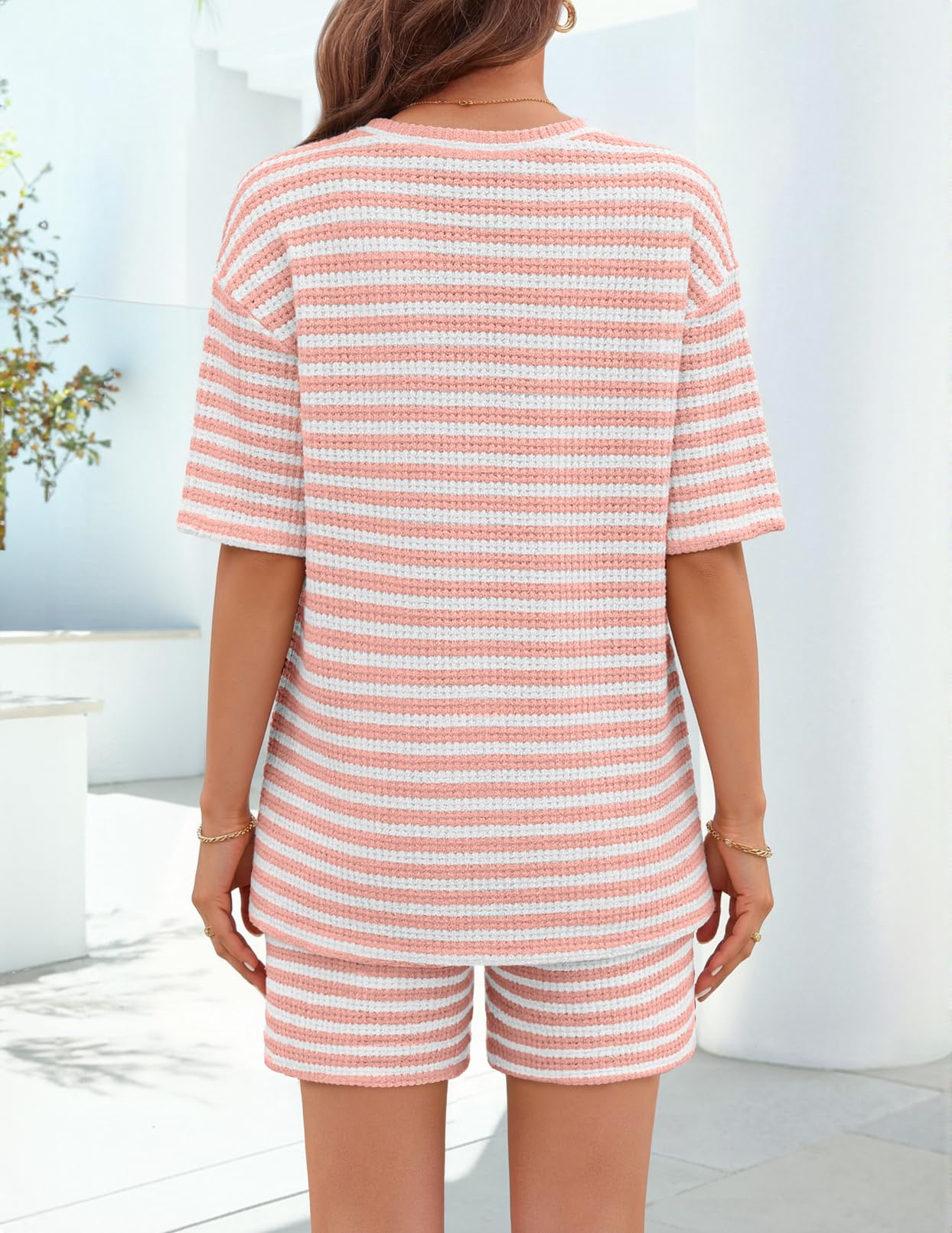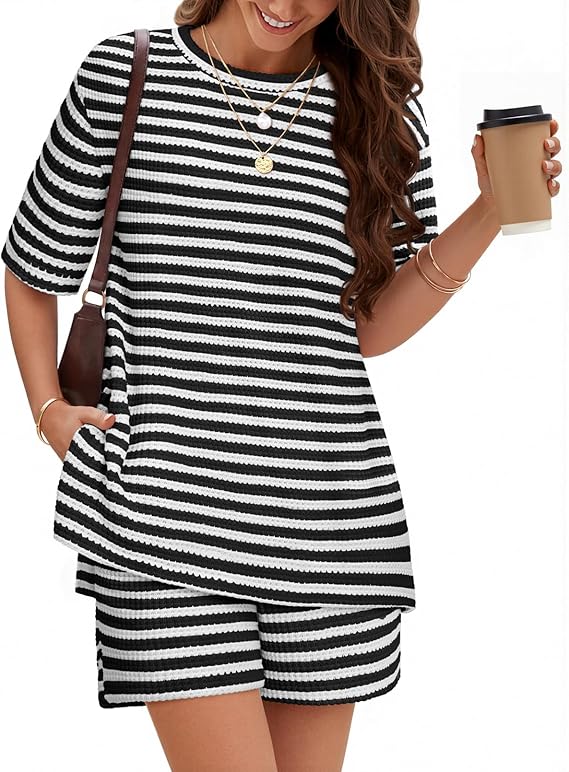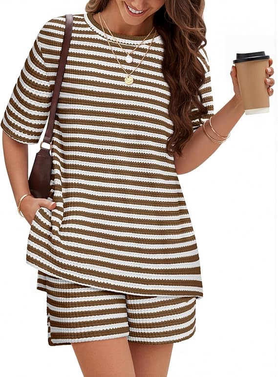 MEROKEETY Women's Summer 2 Piece Lounge Sets 2026 Casual Short Sleeve Striped Knit Tops Shorts Matching Travel Outfits