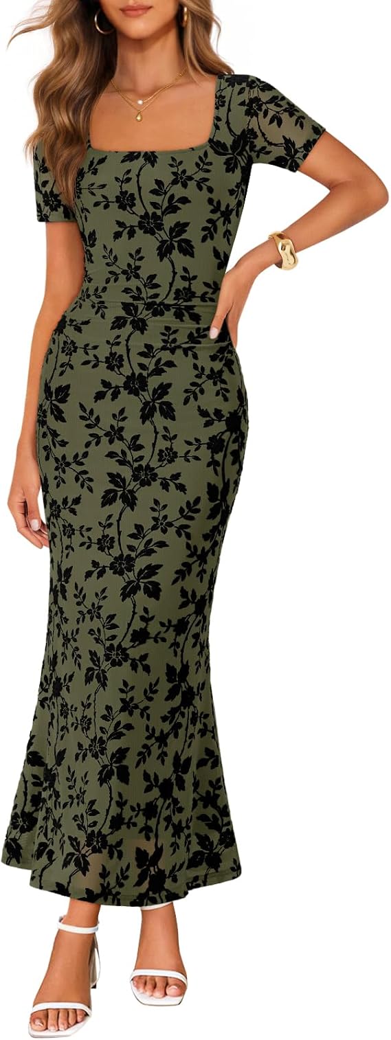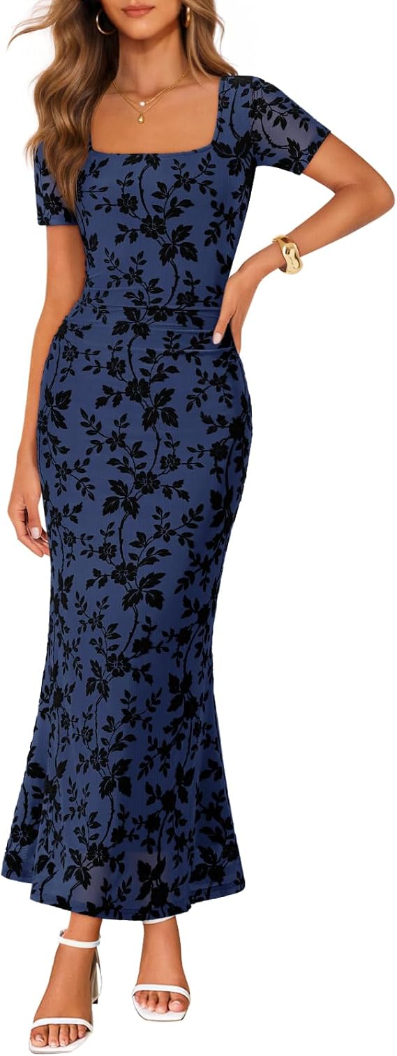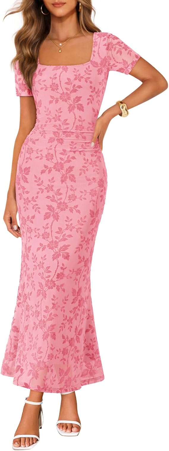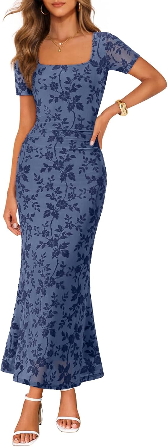 MEROKEETY Women's Summer Floral Bodycon Maxi Dress 2026 Square Neck Short Sleeve Mesh Wedding Guest Cocktail Party Dresses