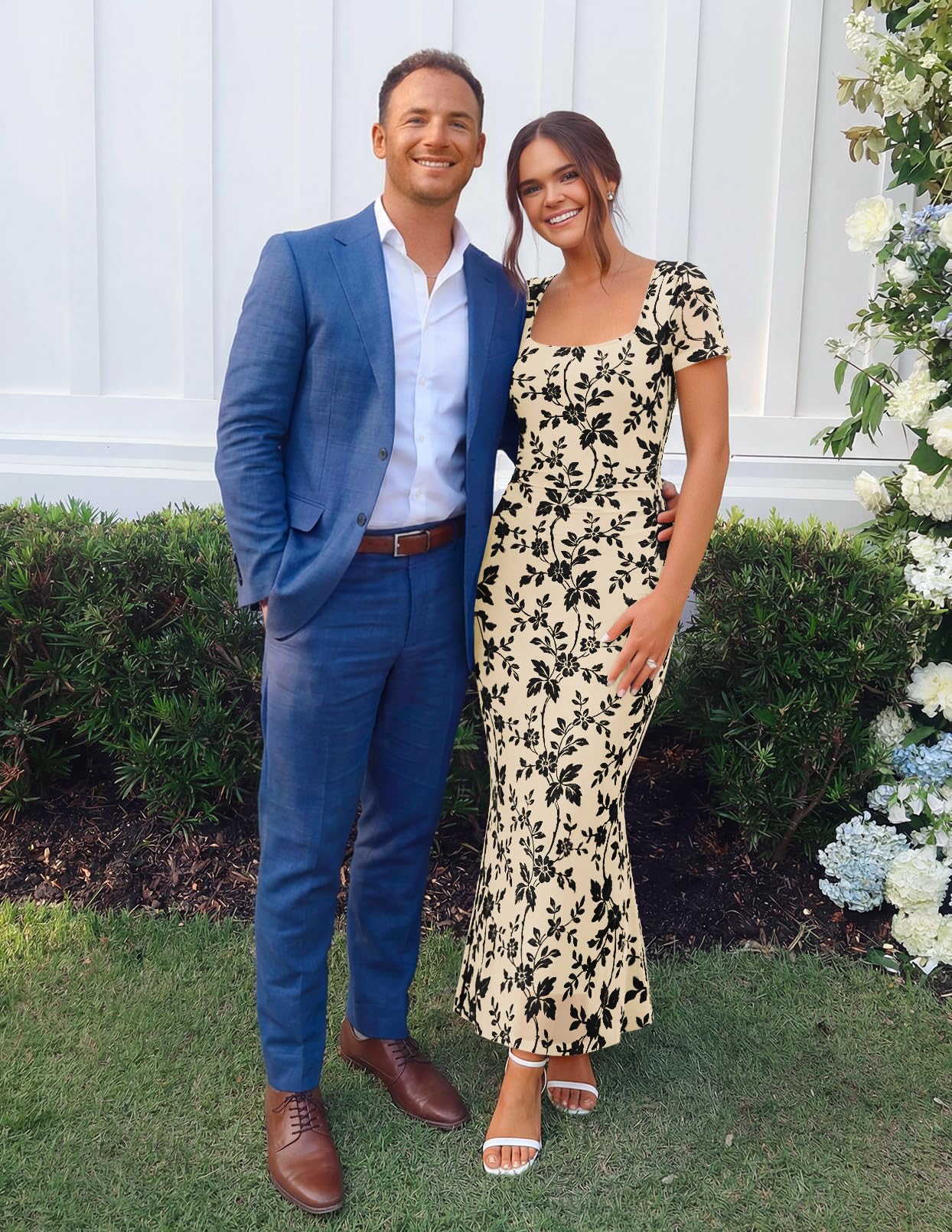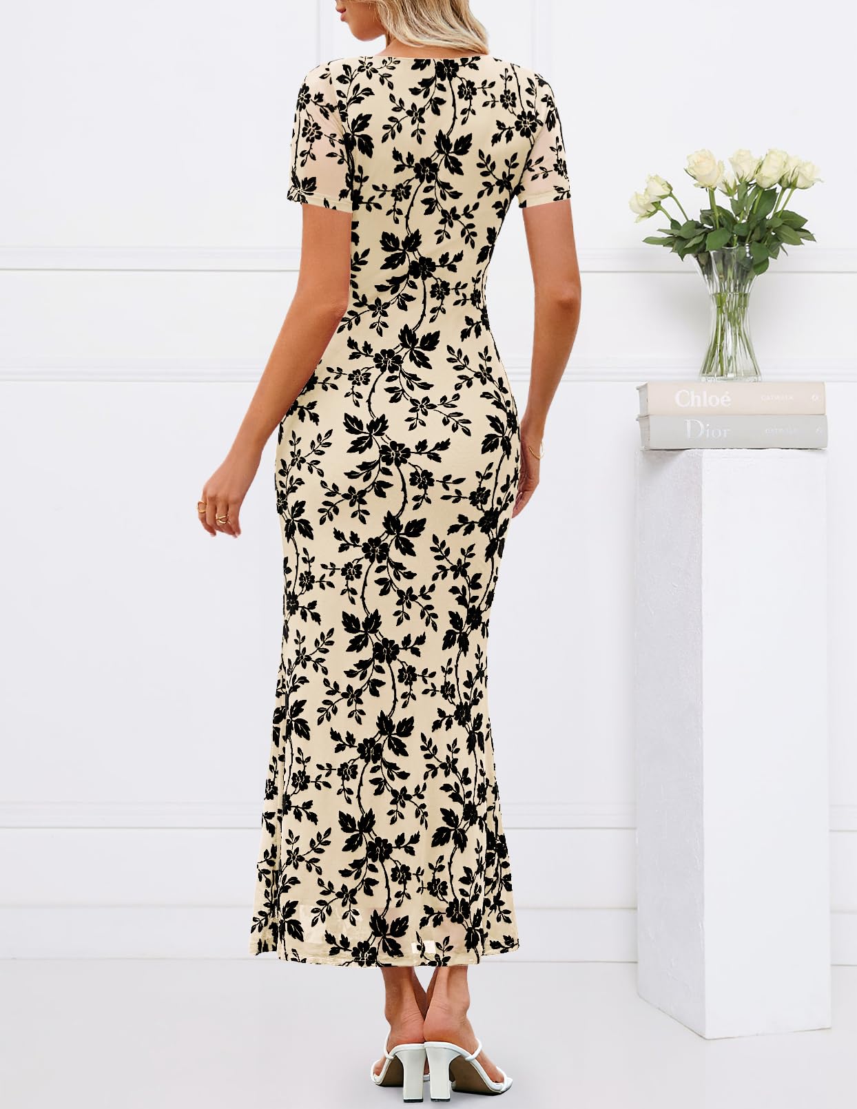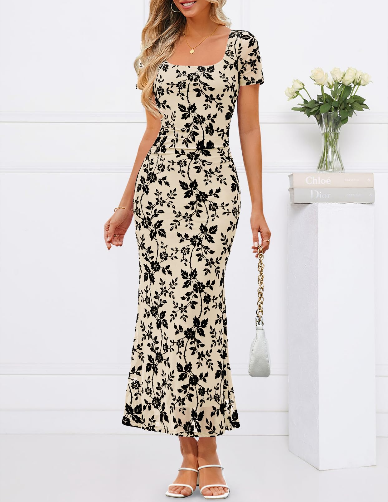 MEROKEETY Women's Summer Floral Bodycon Maxi Dress 2026 Square Neck Short Sleeve Mesh Wedding Guest Cocktail Party Dresses