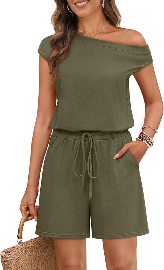 MEROKEETY Rompers for Women 2026 Summer Off The Shoulder Sleeveless Casual Beach Vacation Jumpsuits with Pockets