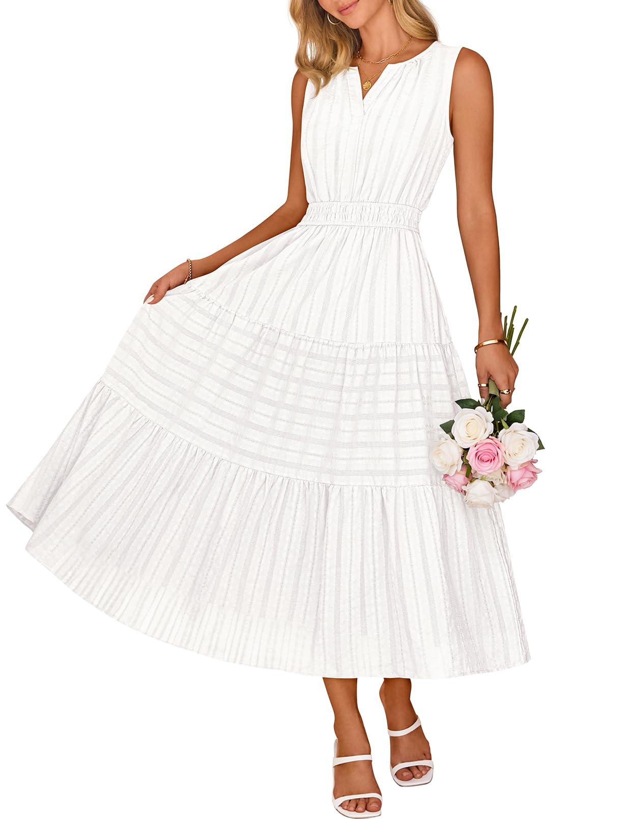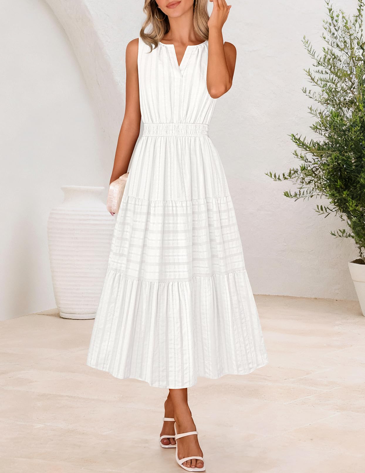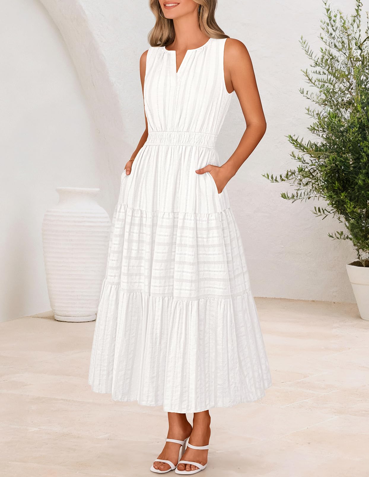 MEROKEETY Summer Midi Dresses for Women 2026 Spring Casual Vacation Sleeveless Boho V Neck Tiered Maxi Dress Pockets, White, Medium