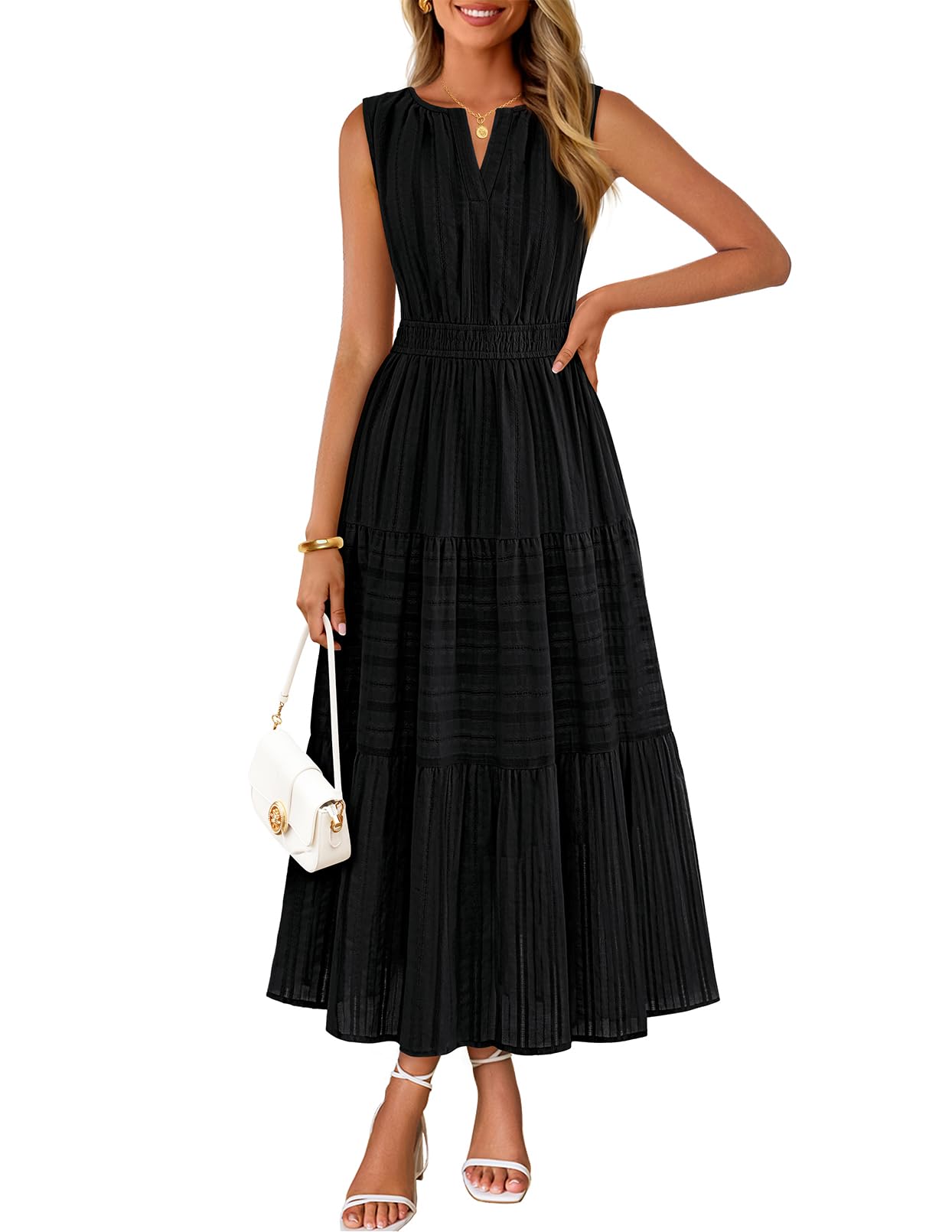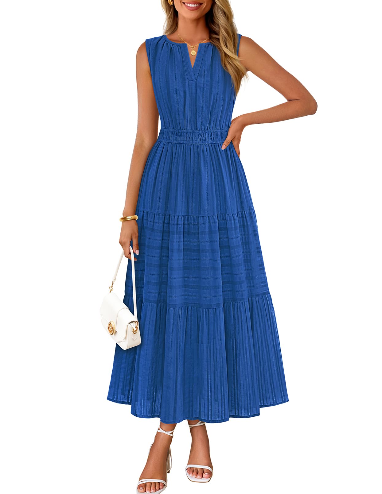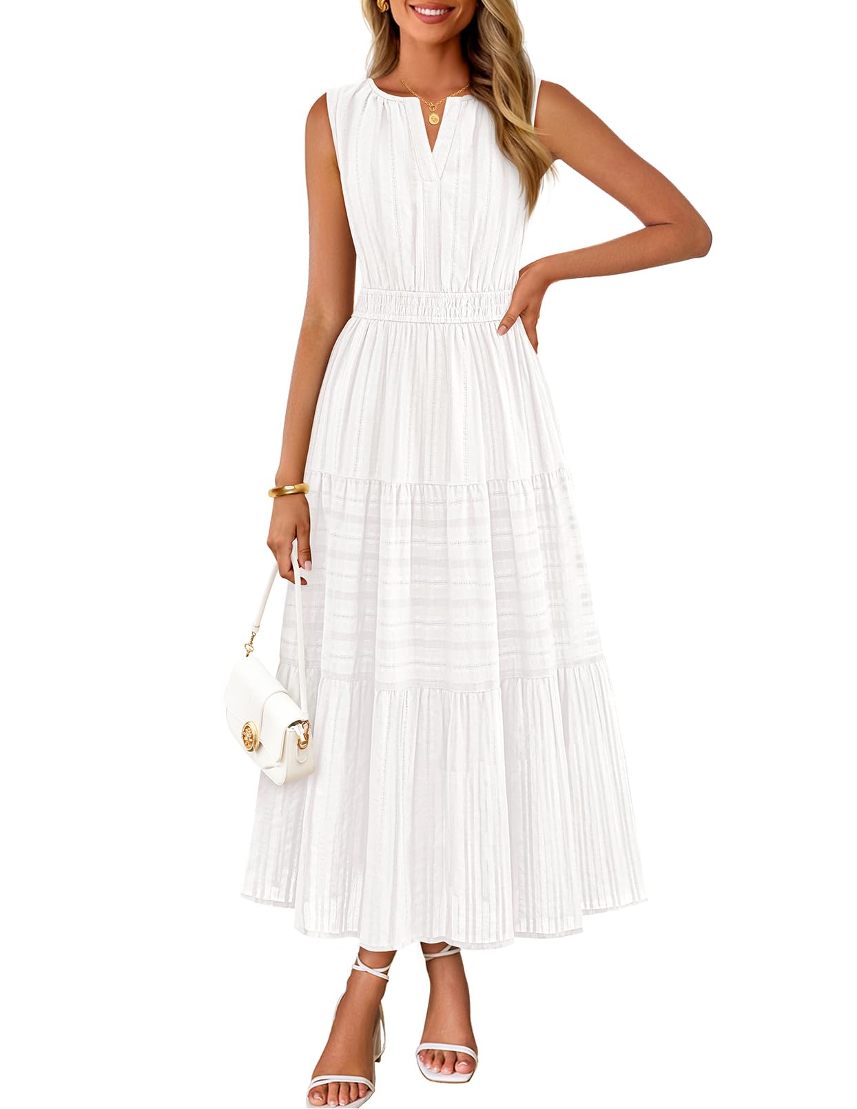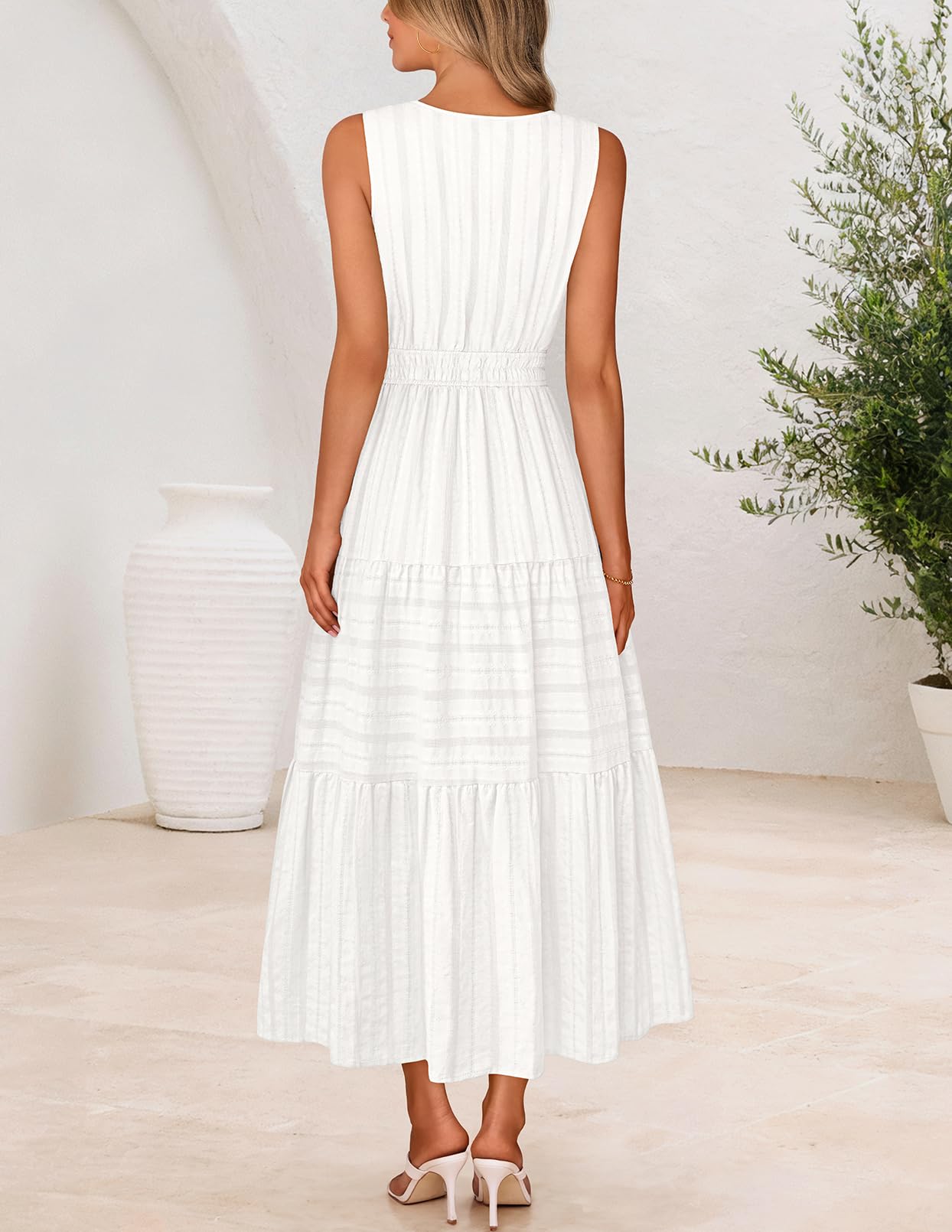 MEROKEETY Summer Midi Dresses for Women 2026 Spring Casual Vacation Sleeveless Boho V Neck Tiered Maxi Dress Pockets, White, Medium