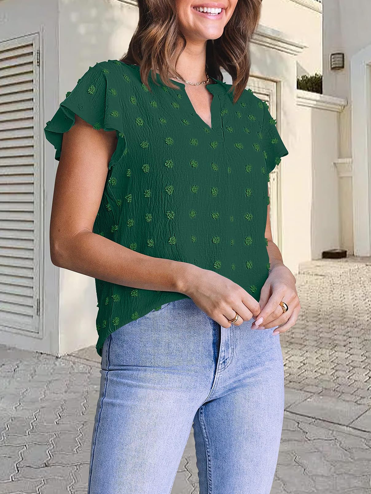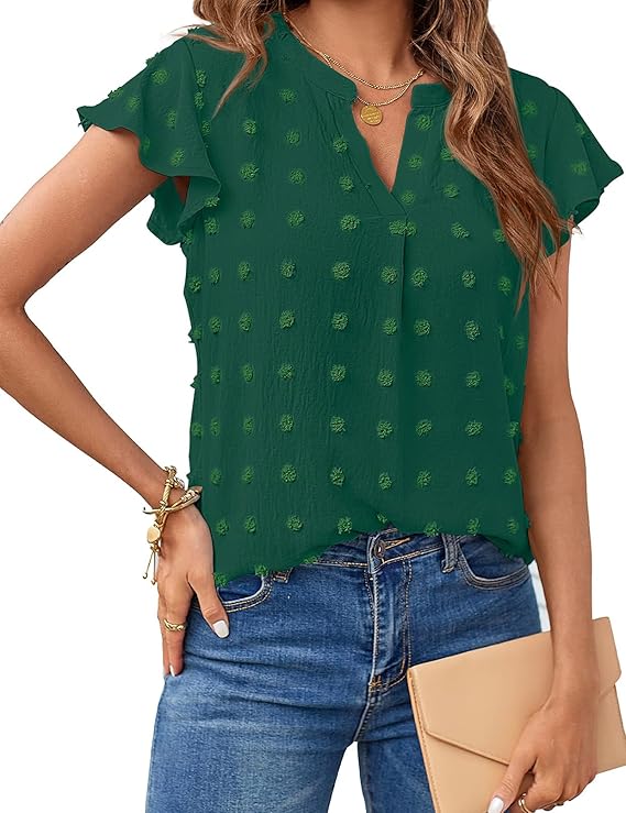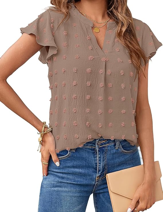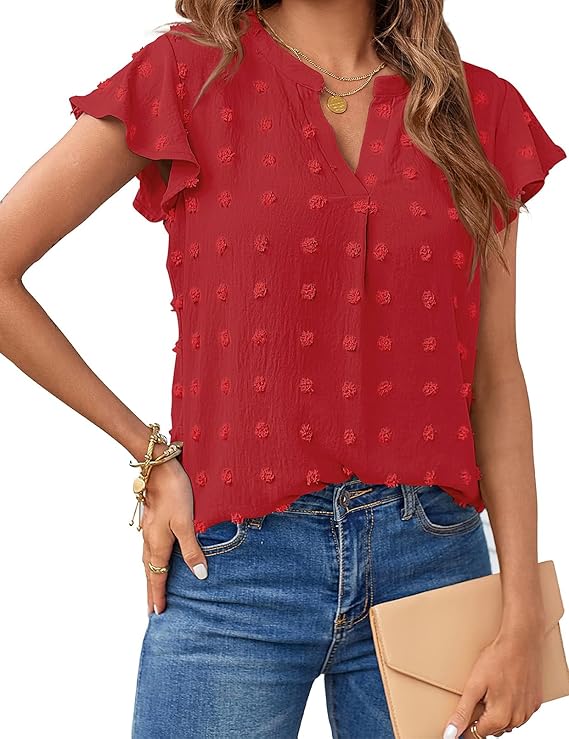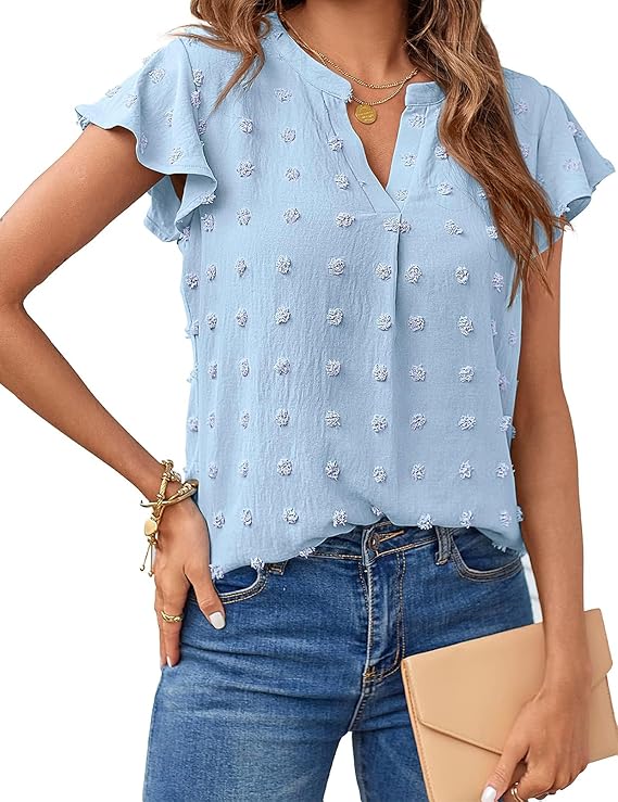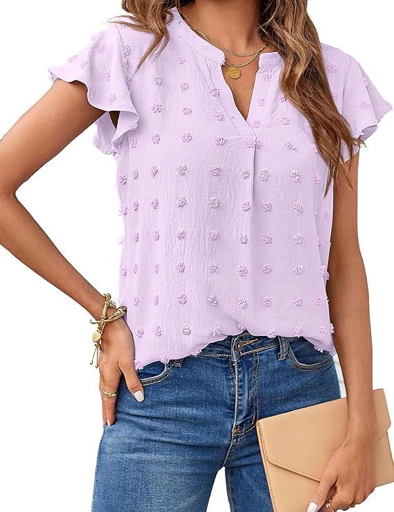 MEROKEETY Women Casual V Neck Flutter Short Sleeve Blouse Swiss Dot Loose Tunic Shirt Top