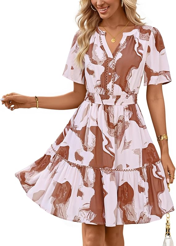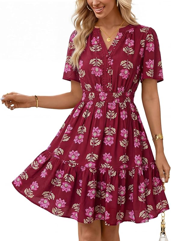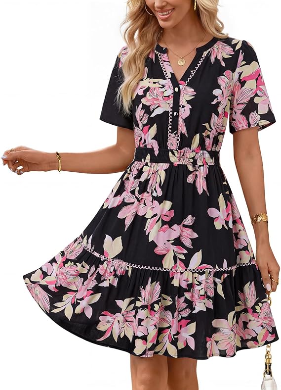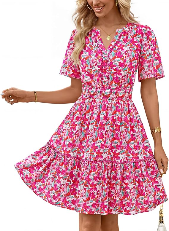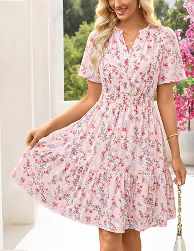 MEROKEETY Women's 2026 Spring Summer Floral Dress V Neck Short Sleeve Button A Line Boho Beach Flowy Vacation Dresses