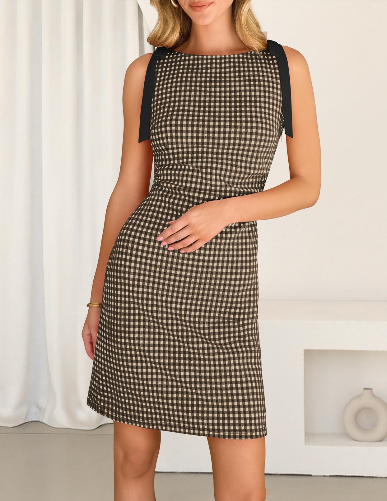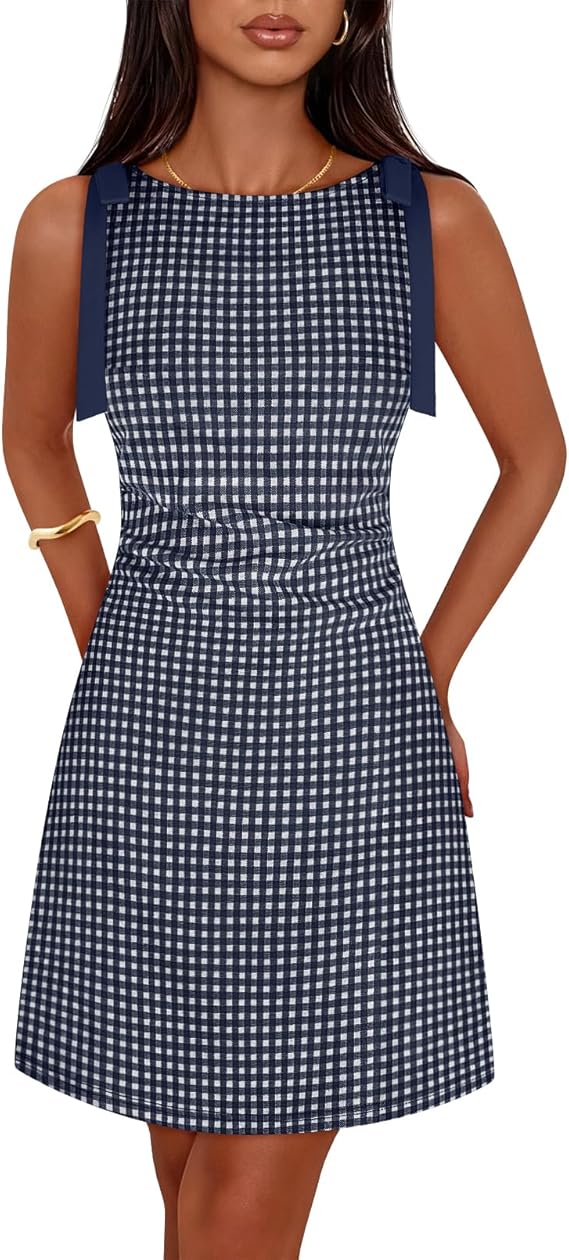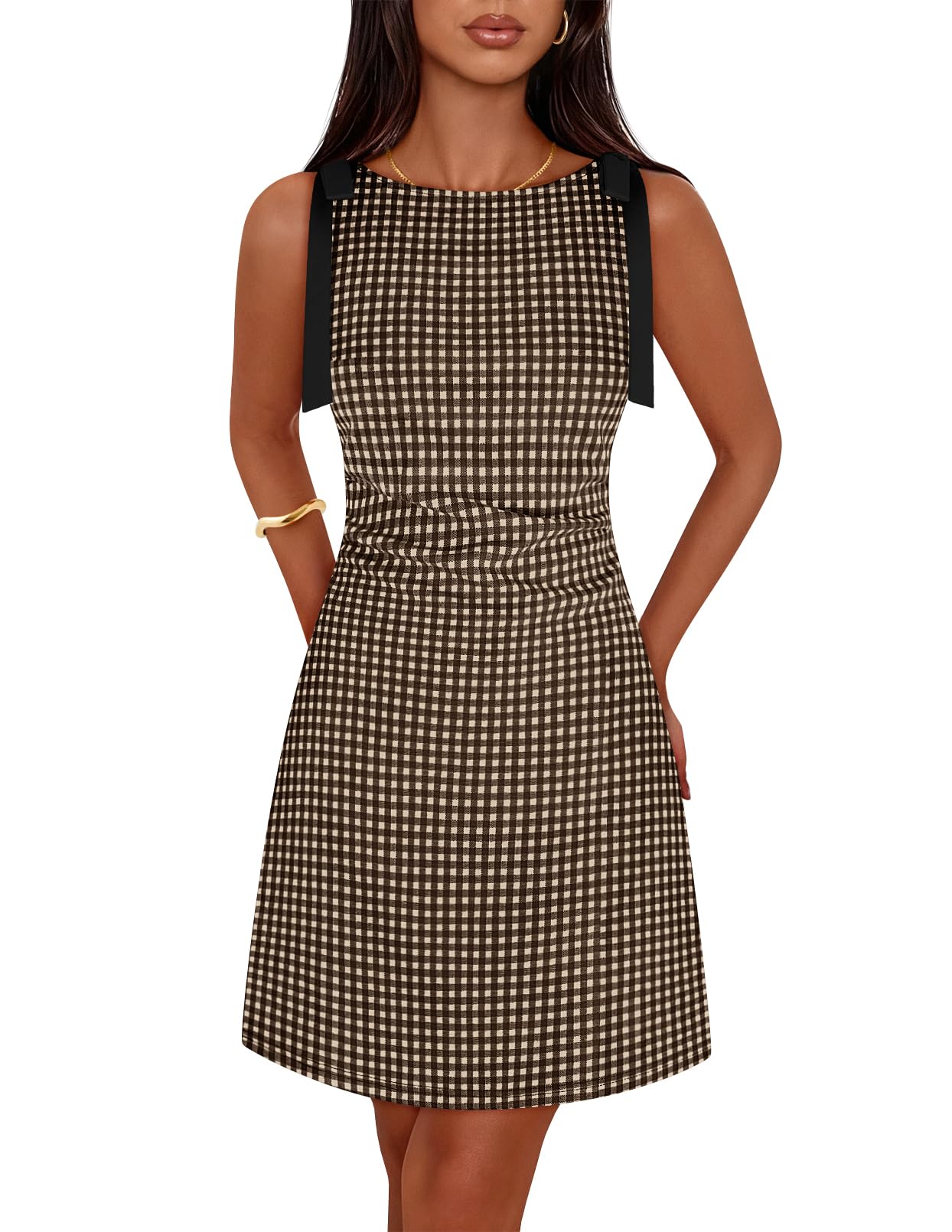 MEROKEETY Women's 2026 Summer Gingham Mini Dress Ruched Sleeveless Boat Neck Cocktail Party Beach Dresses