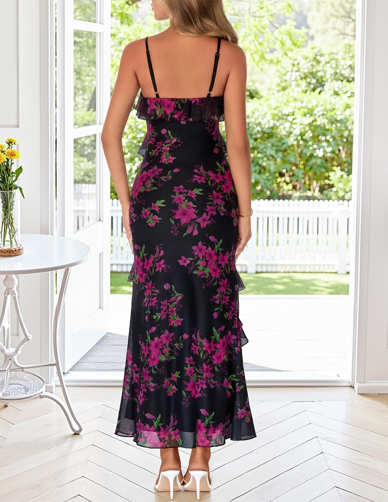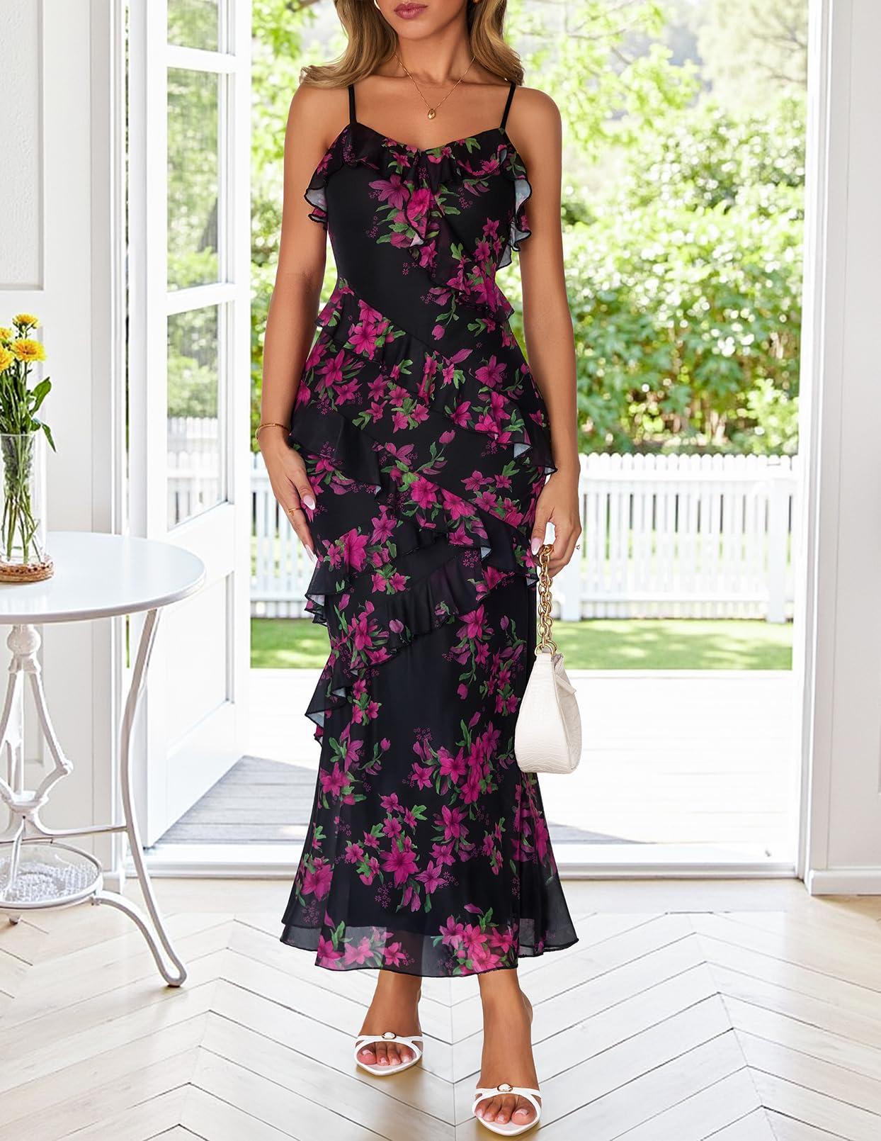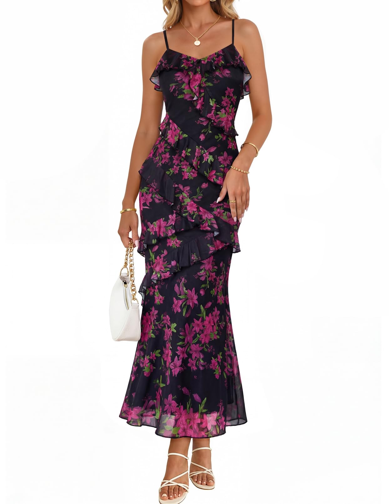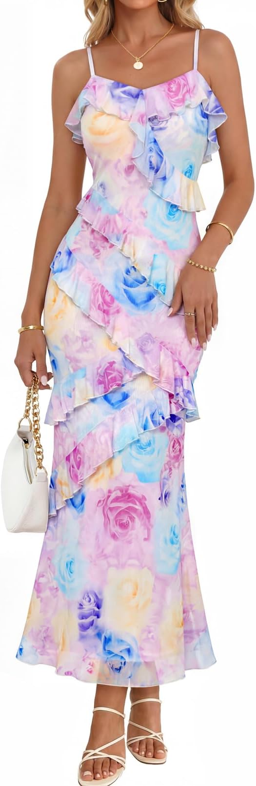 MEROKEETY Women's Floral Maxi Dress 2026 Summer Beach Spaghetti Strap Ruffle Bodycon Wedding Guest Cocktail Long Dresses