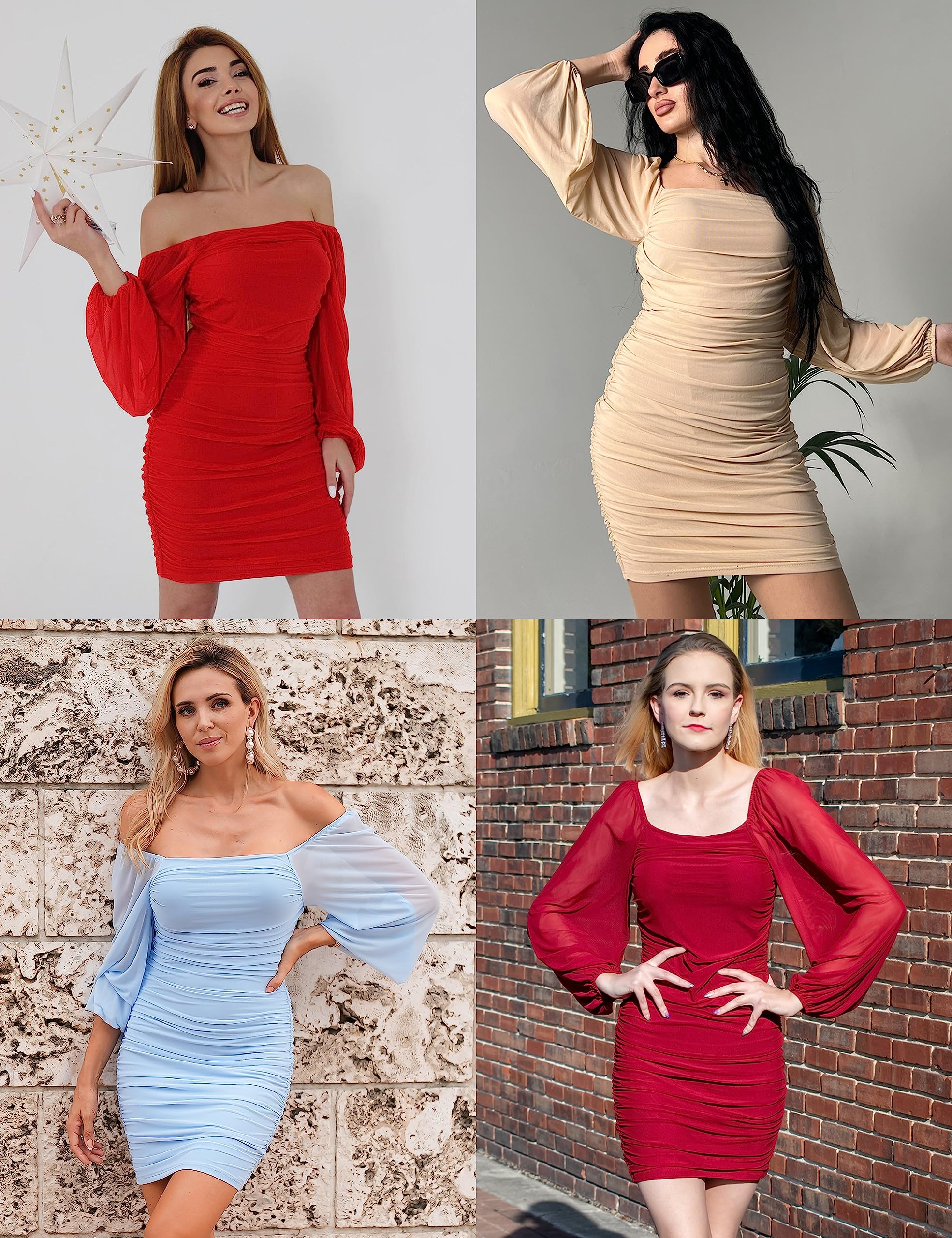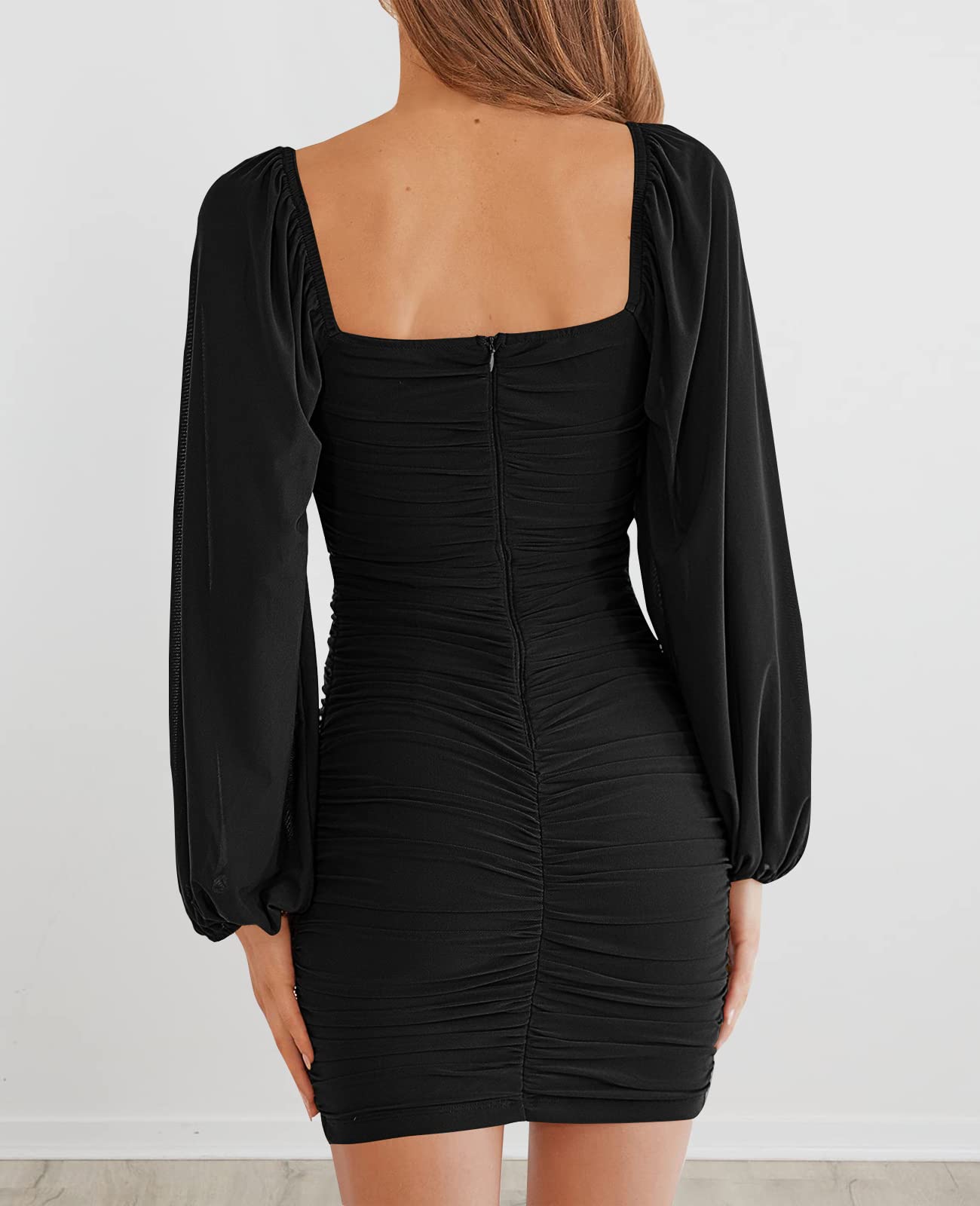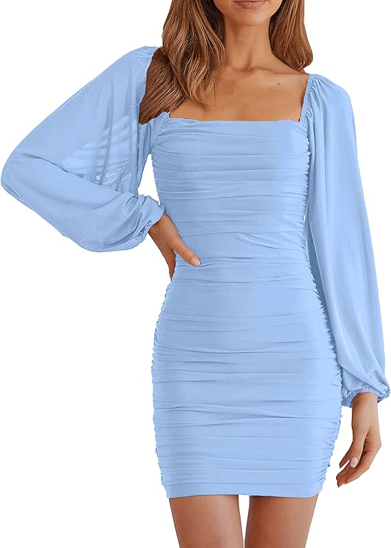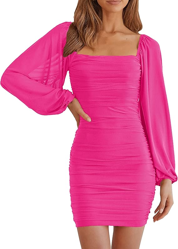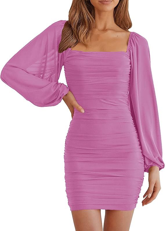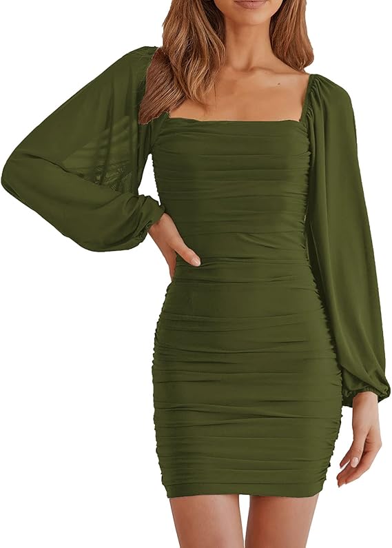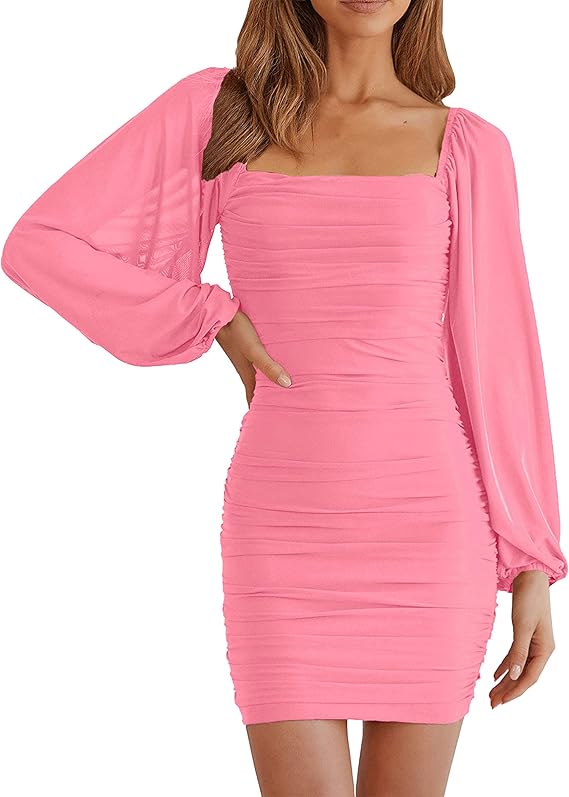 MEROKEETY Womens Long Sleeve Mesh Bodycon Cocktail Dress 2026 Square Neck Ruched Club Mini Dress