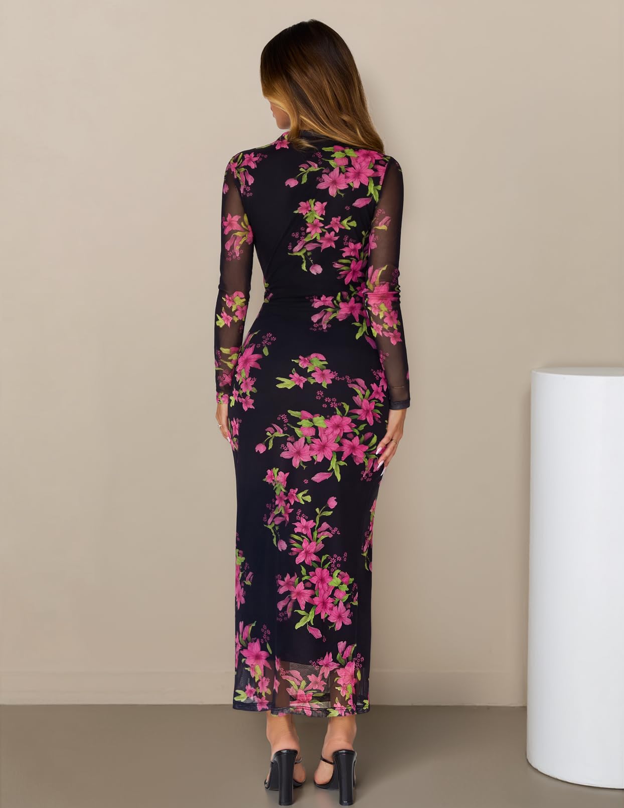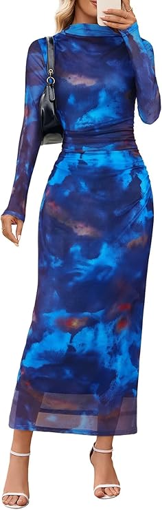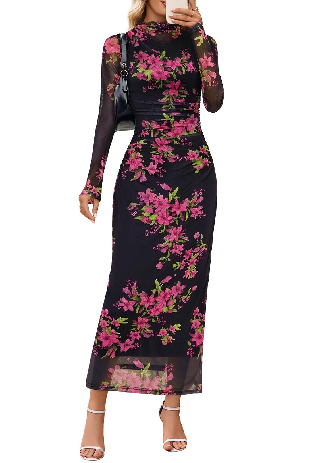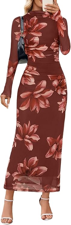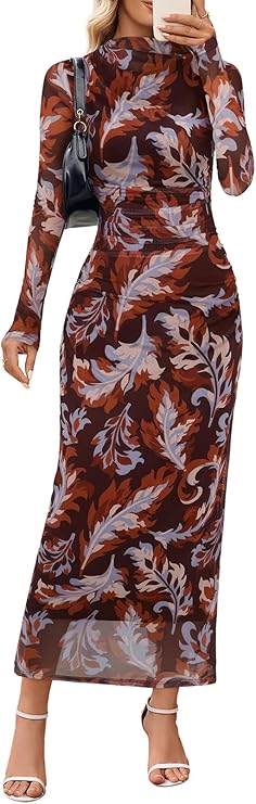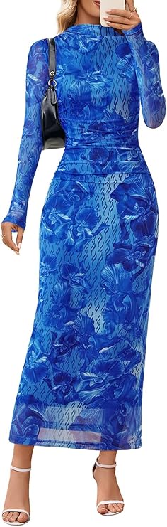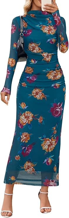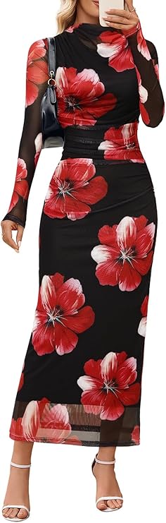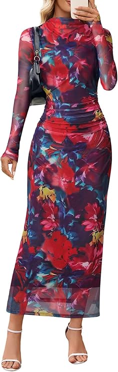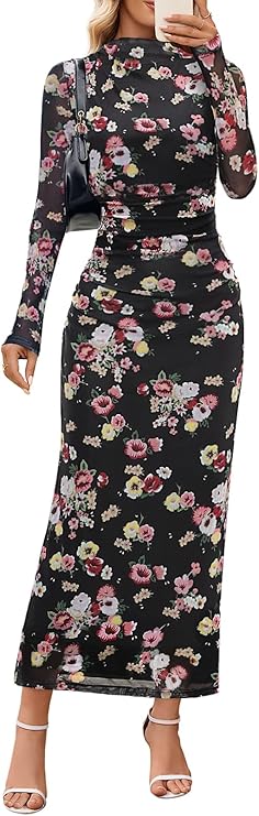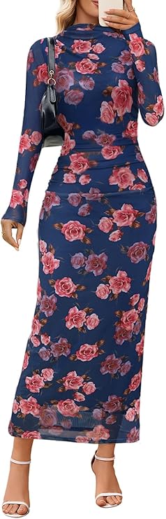 MEROKEETY Women's Spring Wedding Guest Dress 2026 Long Sleeve Bodycon Floral Mesh Fall Cocktail Holiday Party Maxi Dresses