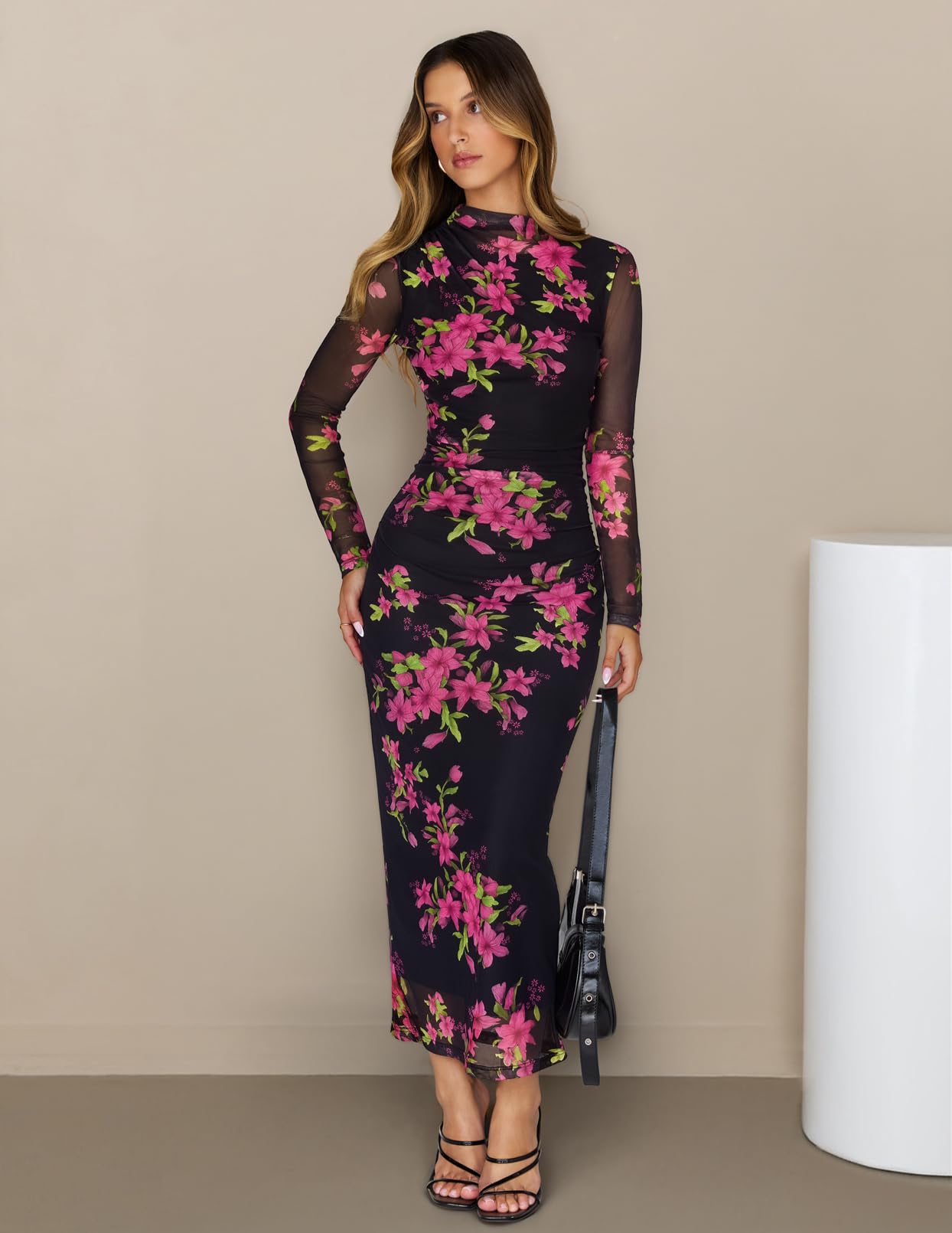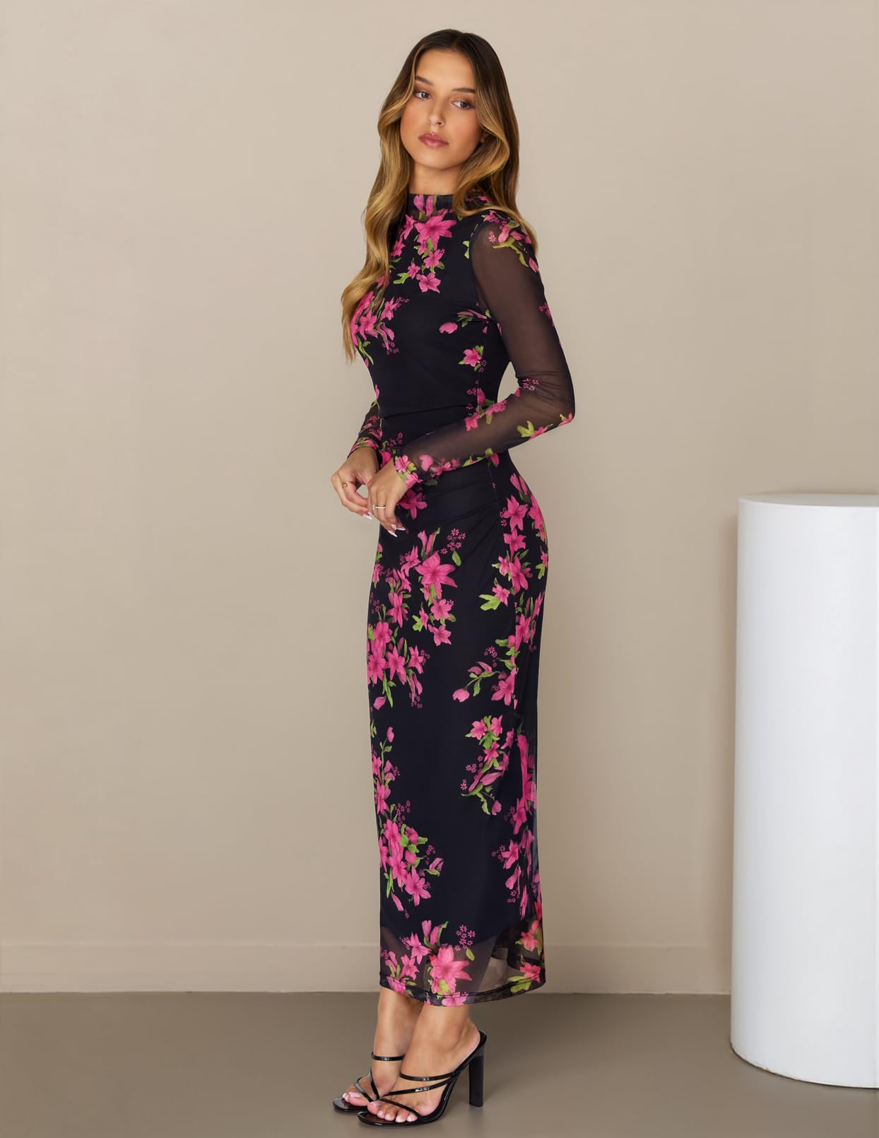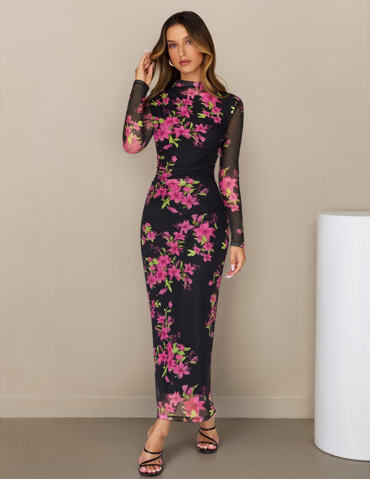 MEROKEETY Women's Spring Wedding Guest Dress 2026 Long Sleeve Bodycon Floral Mesh Fall Cocktail Holiday Party Maxi Dresses