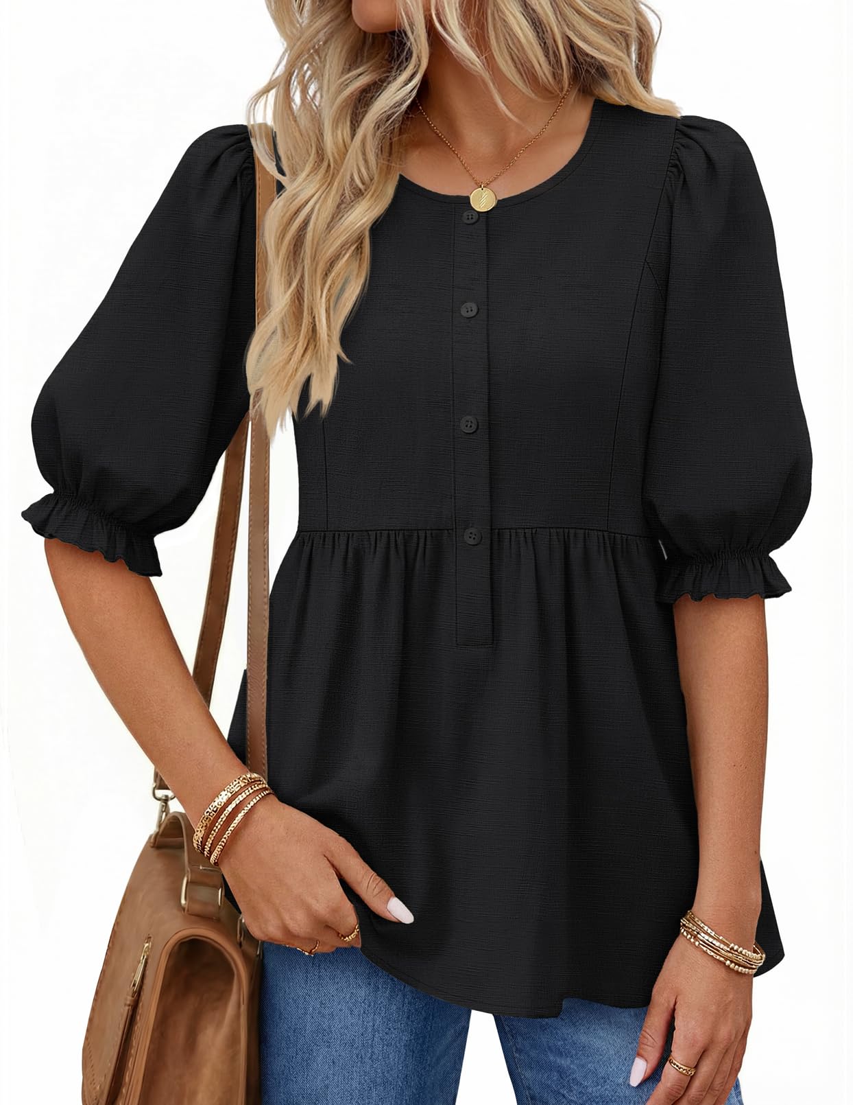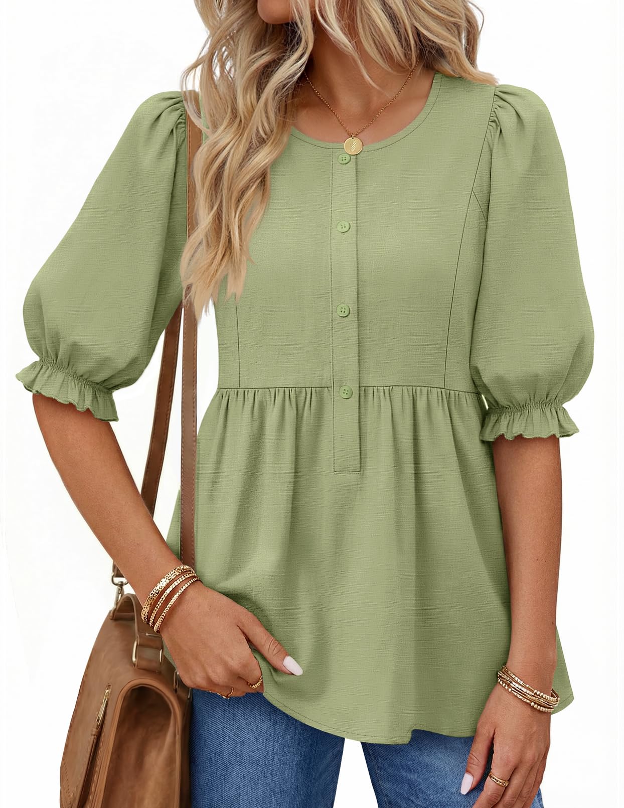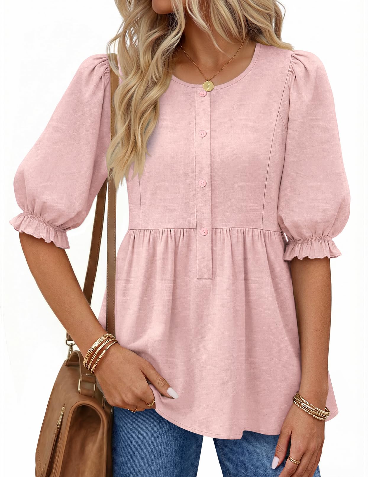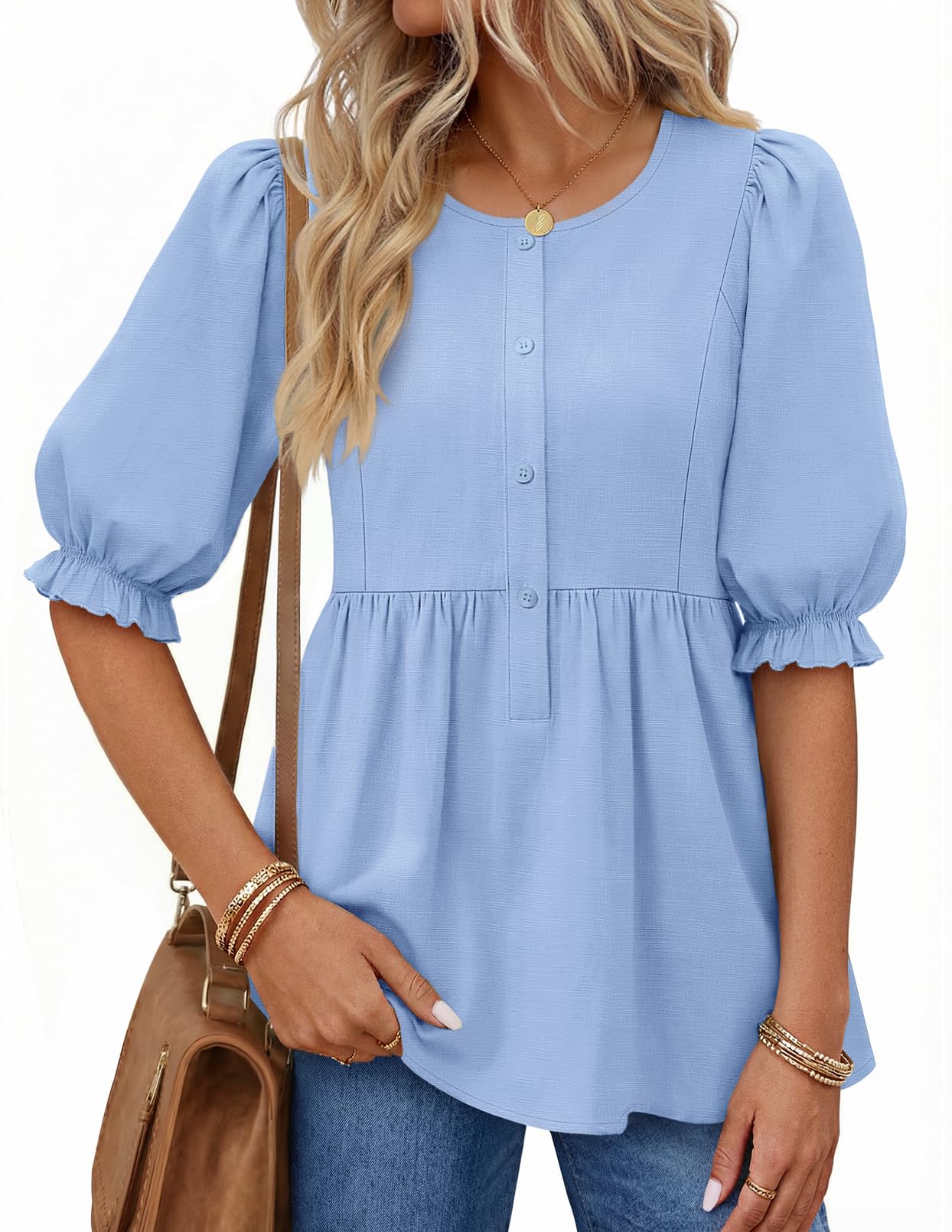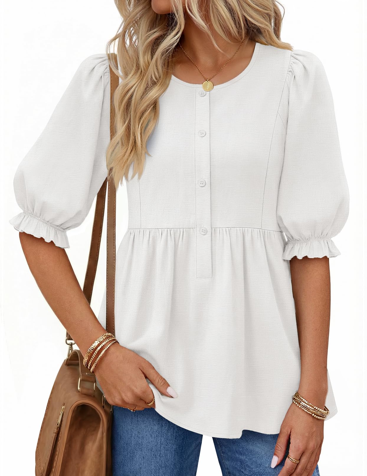 Features: This cute women's blouse features a round neck, babydoll style, puff short sleeve with elastic ruffle cuff, button front, peplum pleated waist, A-line loose fit, and lightweight breathable material. Babydoll tops for women, peplum tops for women, cute tops for women