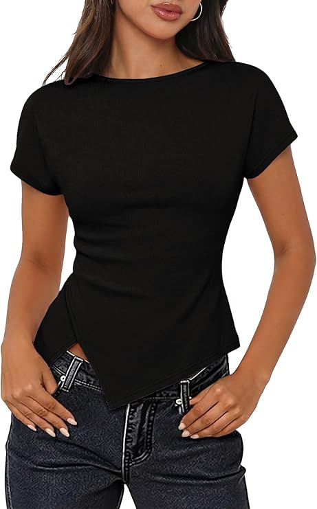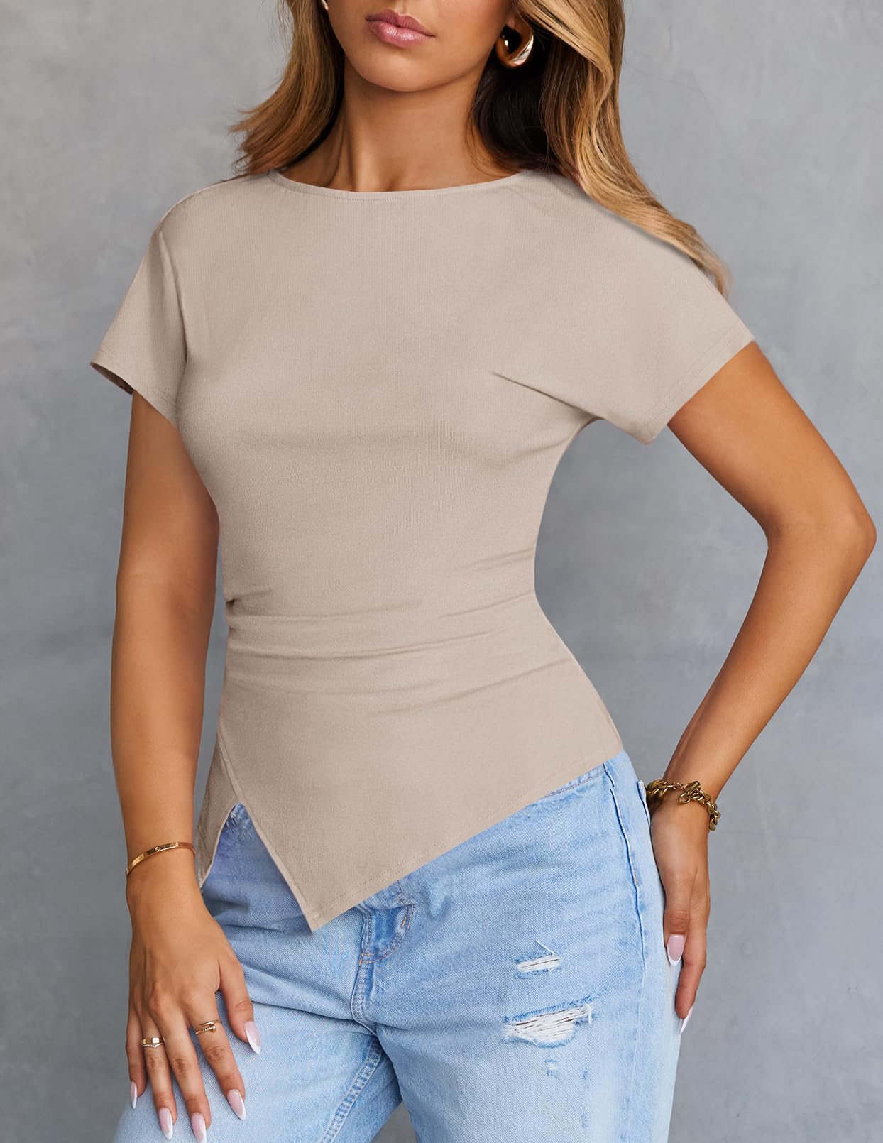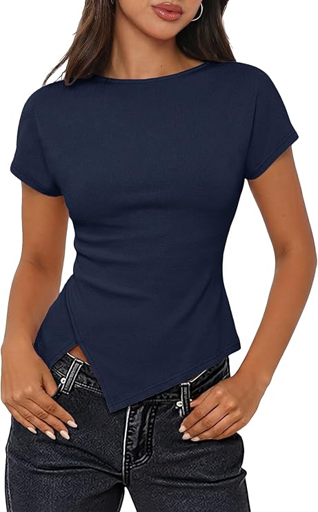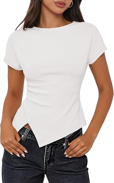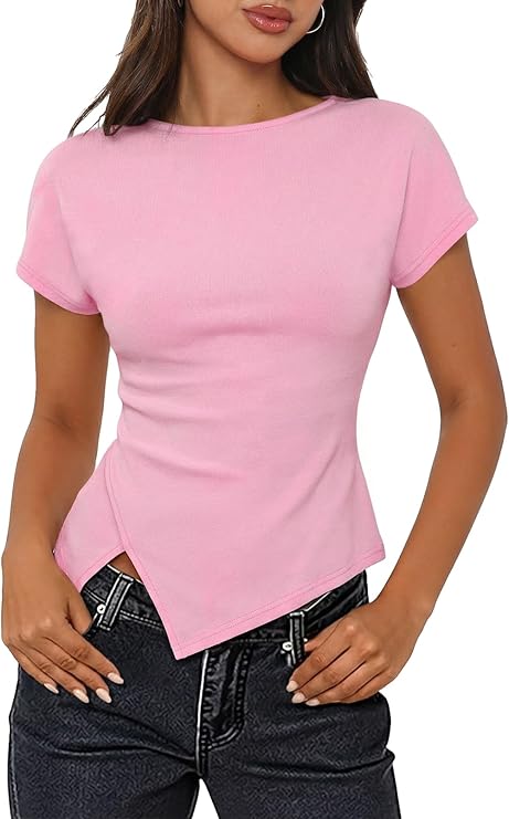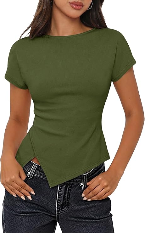 MEROKEETY Women's Summer Boat Neck Basic Tops 2026 Short Sleeve Ruched Slim Fit Going Out T-Shirts Trendy Y2K Clothes