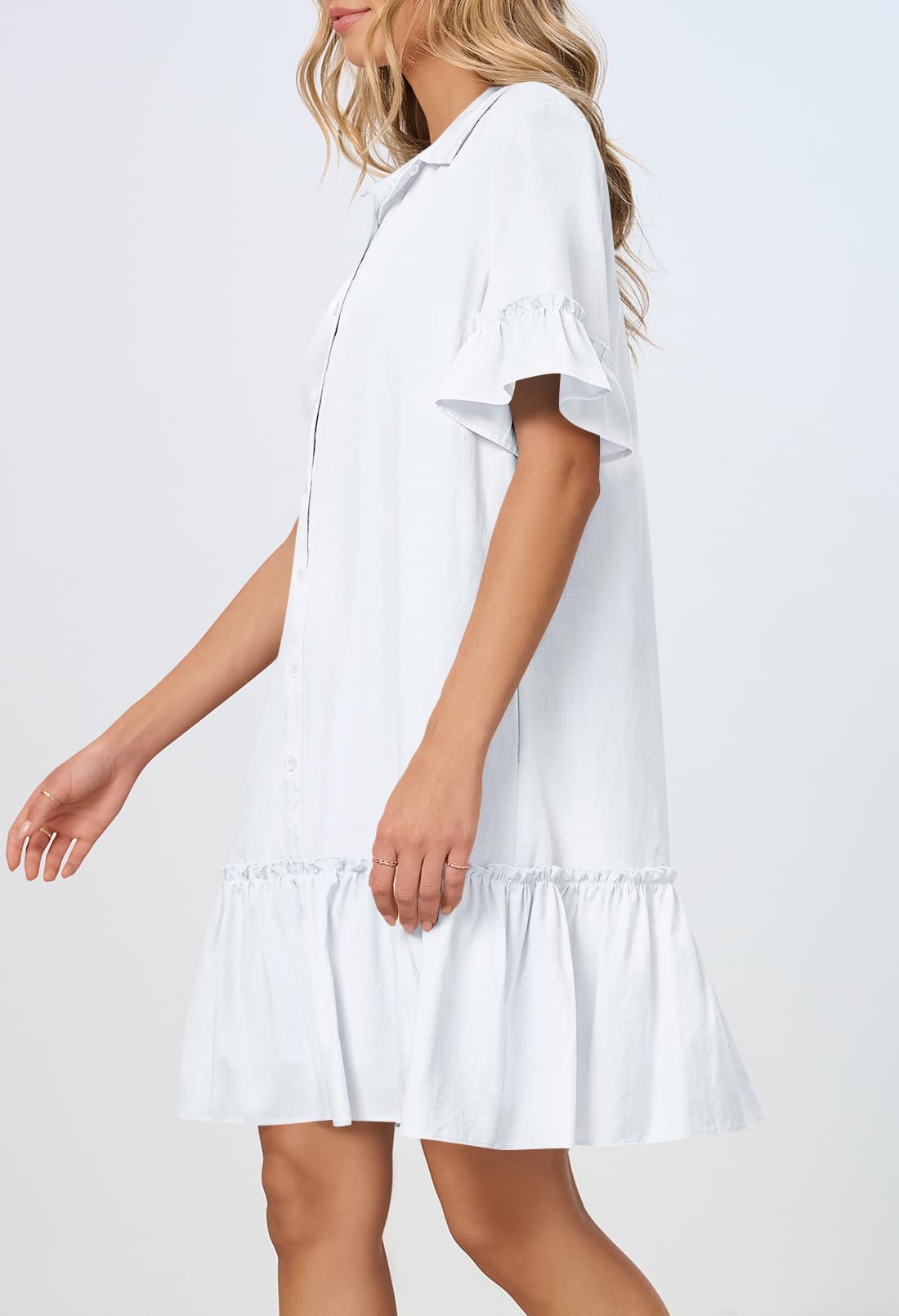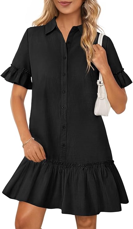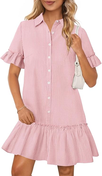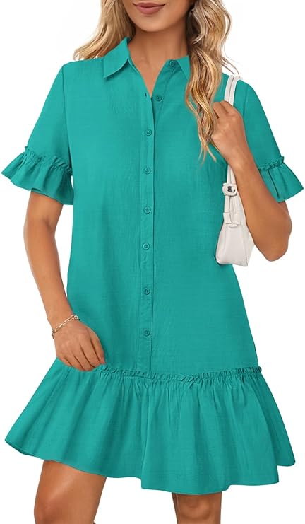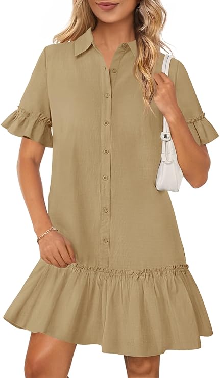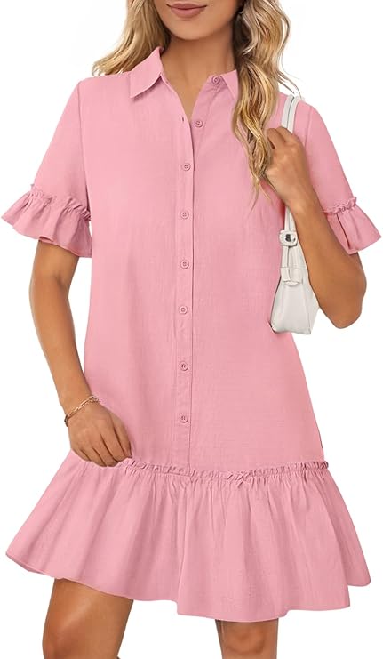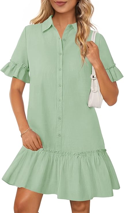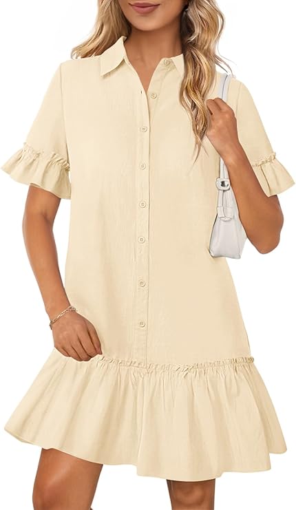 MEROKEETY Women's Summer Button Down Shirt Dress Casual Ruffle Sleeve Shift Mini Dresses with Pockets