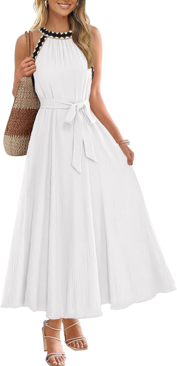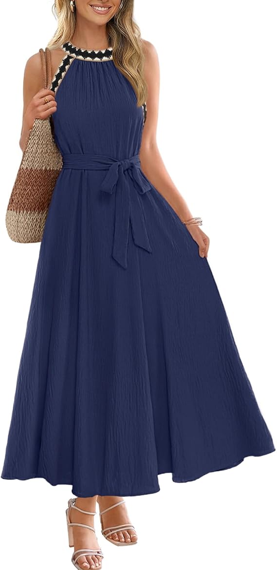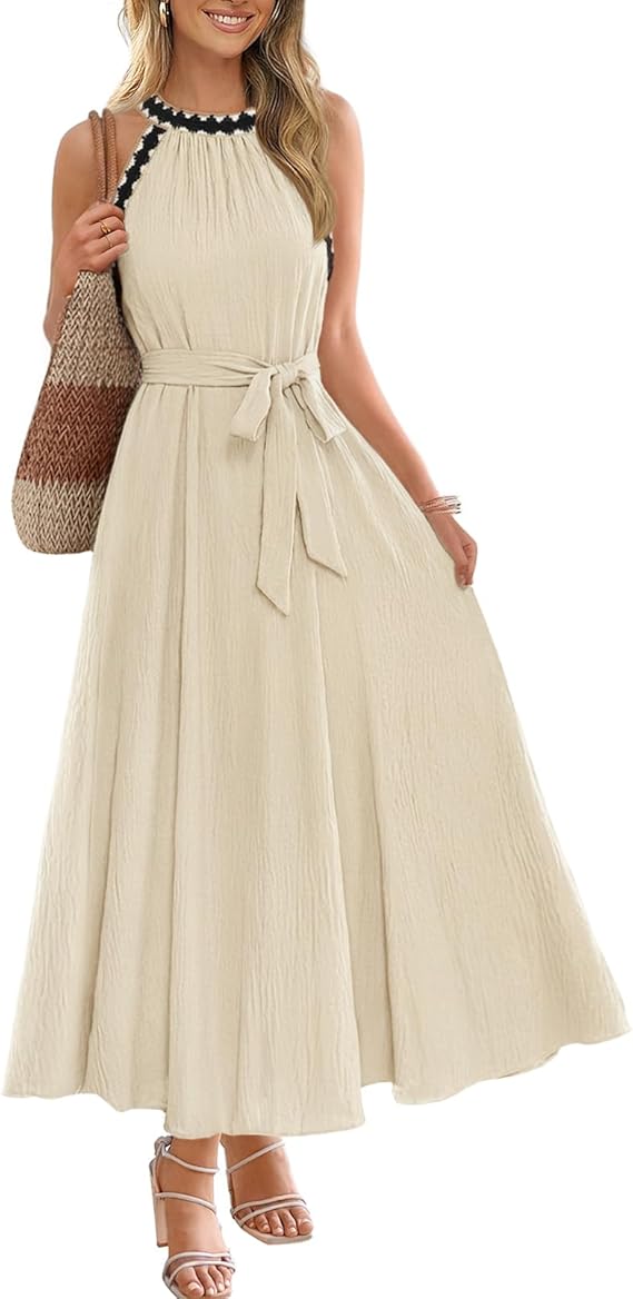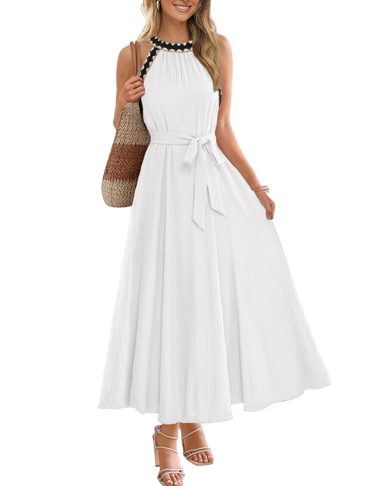 MEROKEETY Women's Summer Sleeveless Halter Neck Maxi Dress 2026 Boho Flowy Swing Beach Vacation Dresses with Belt