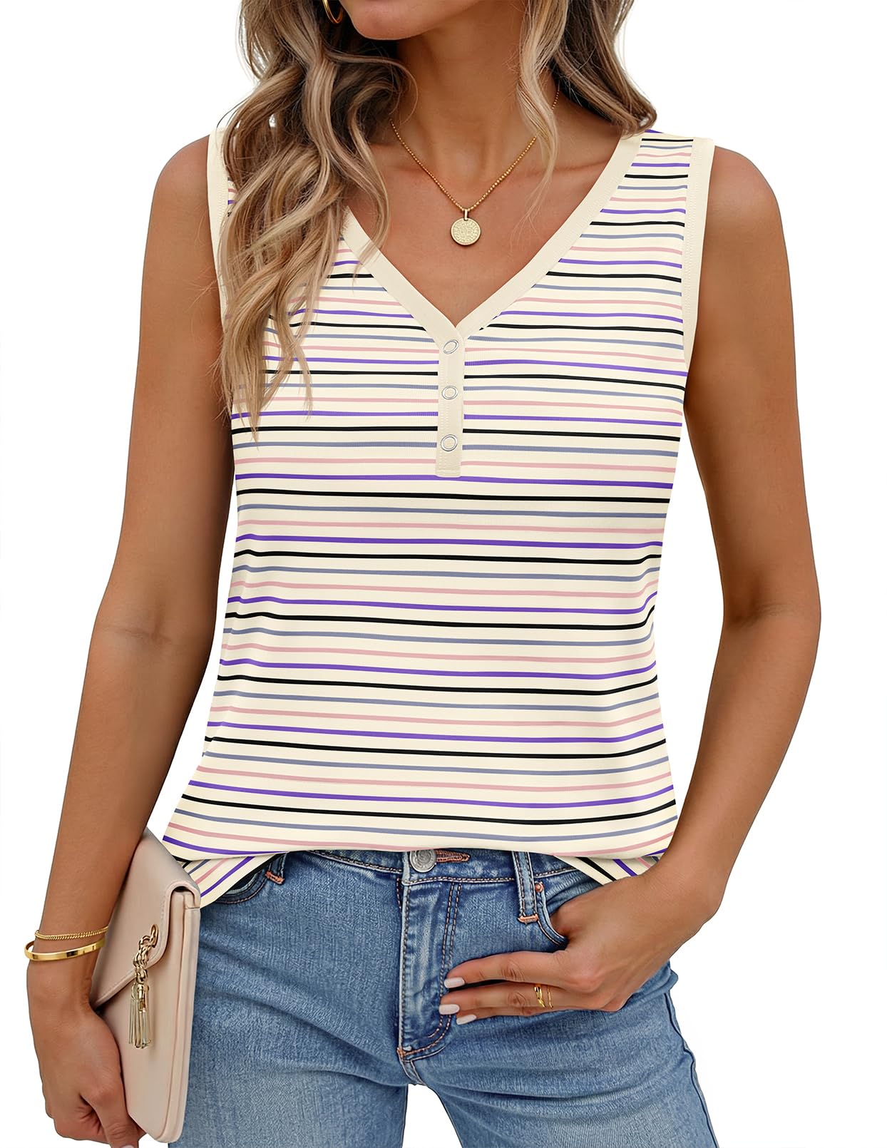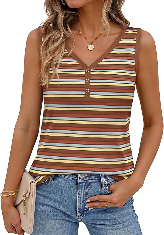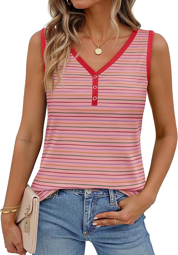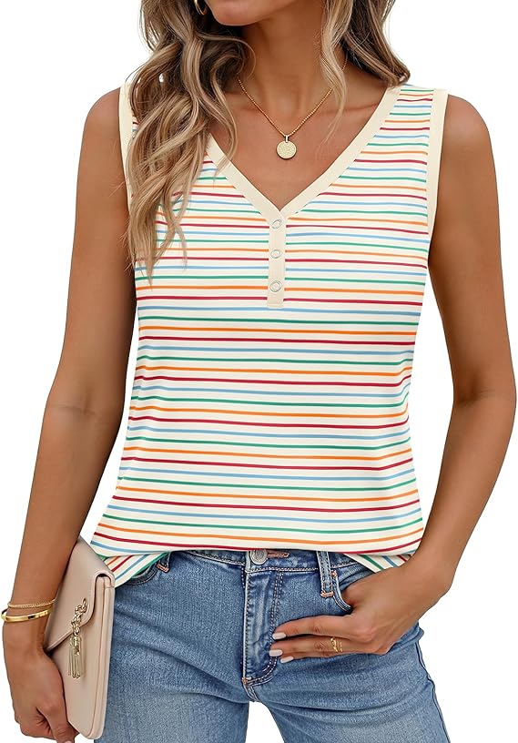 MEROKEETY Women's Summer Tank Tops 2026 Striped V Neck Sleeveless Casual Henley Shirts Colourful Button Cami Tee